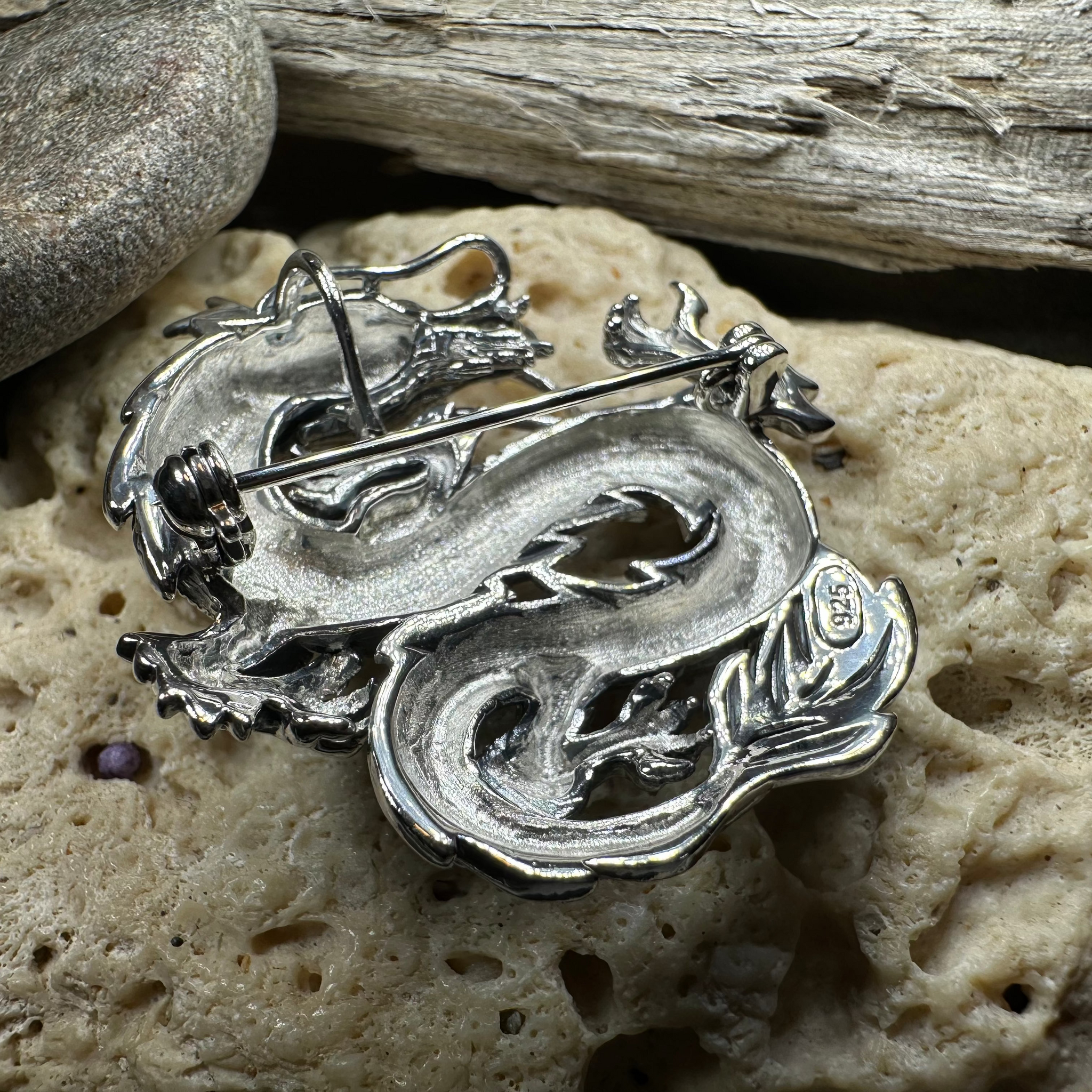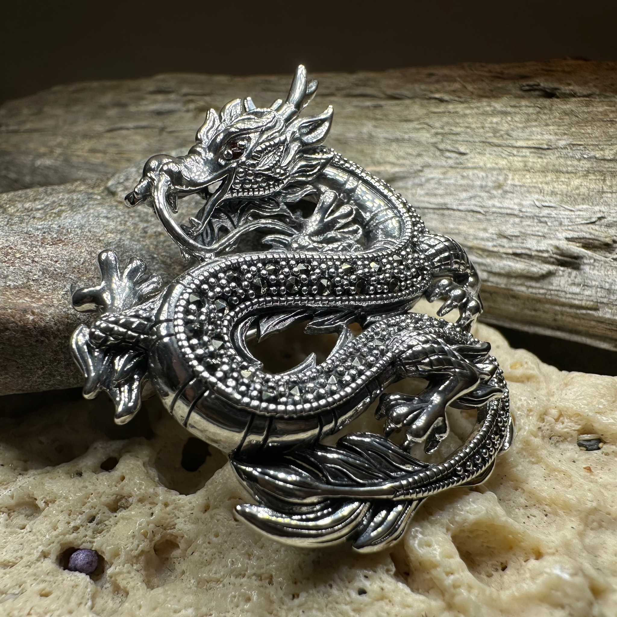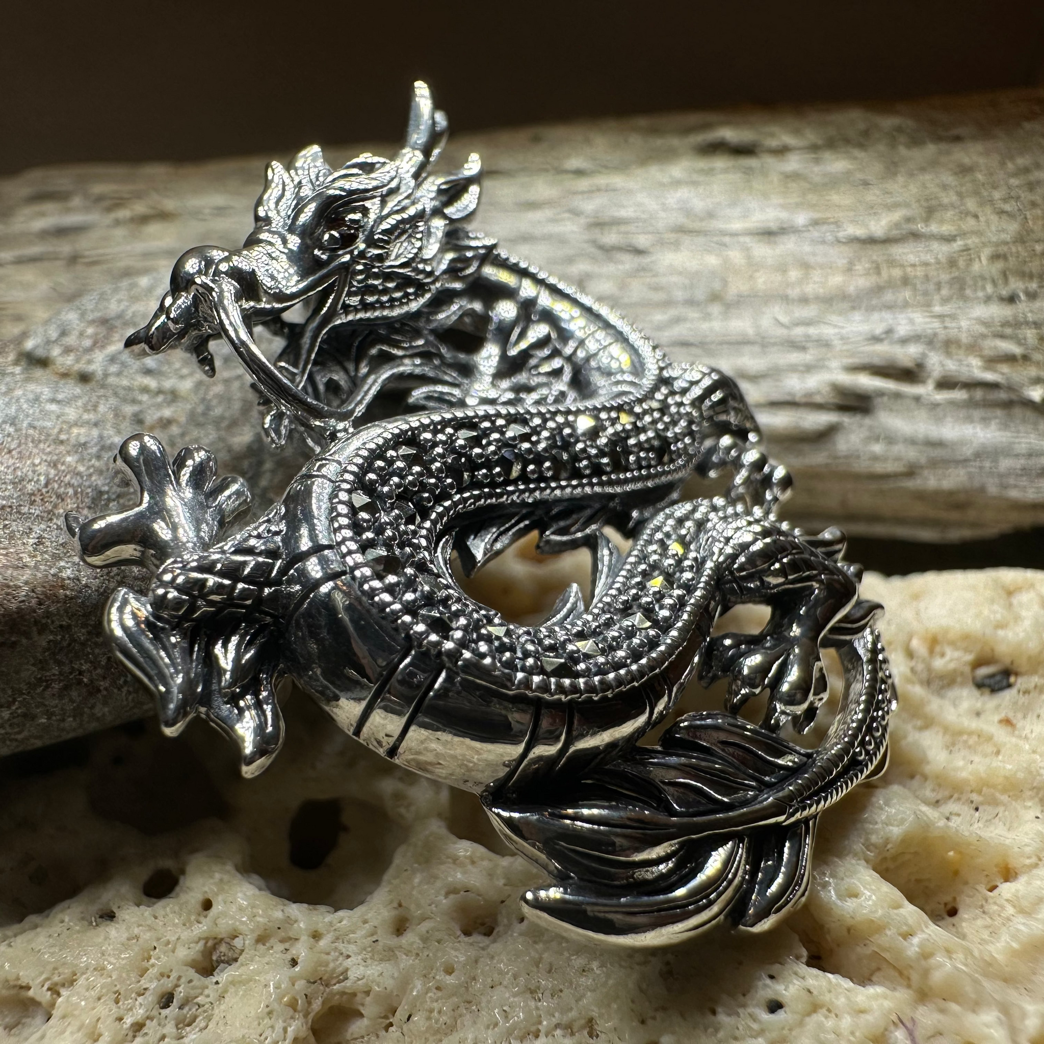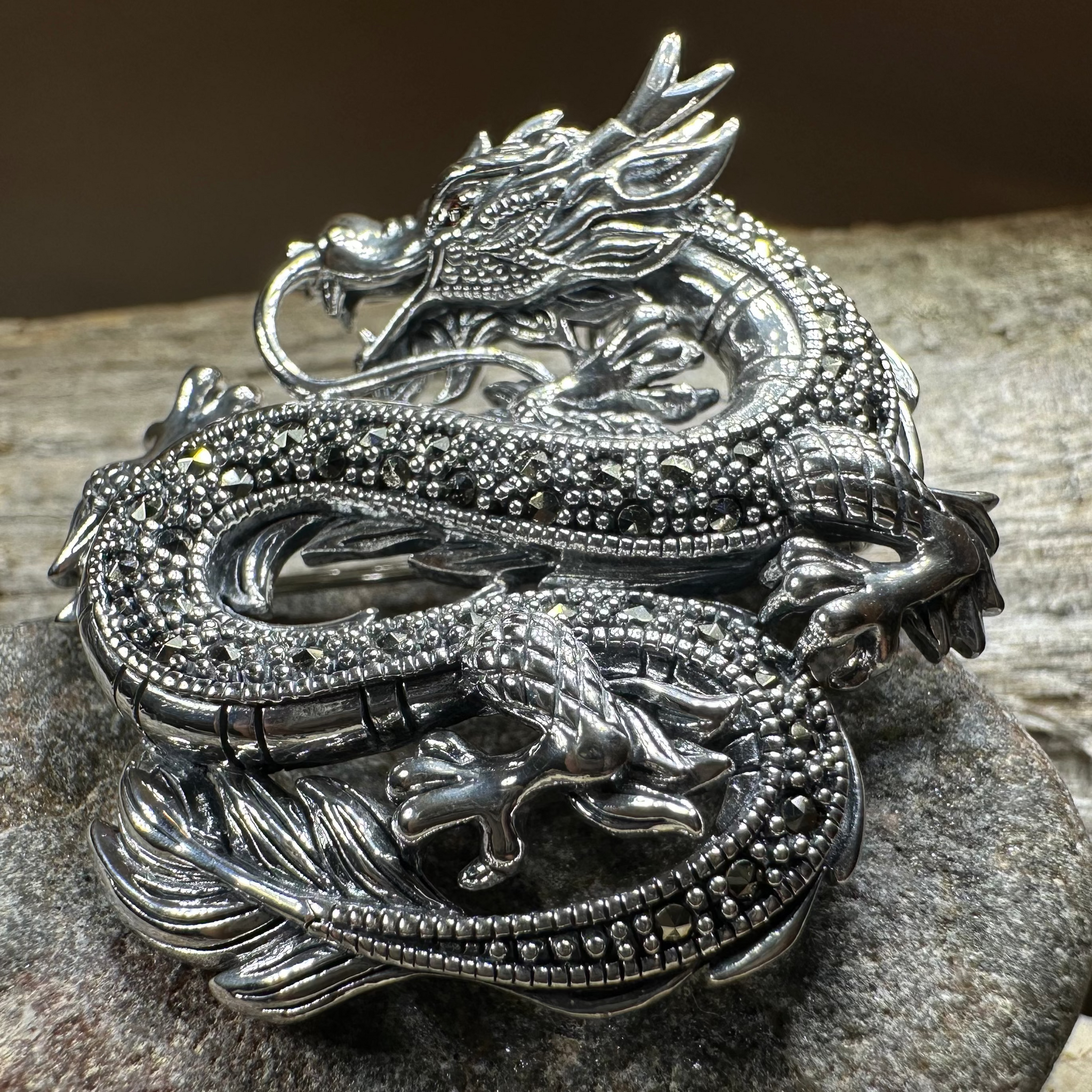 This unique piece was created with solid sterling silver and marcasite detailing to create a dramatic and magical dragon brooch that will be a special gift.