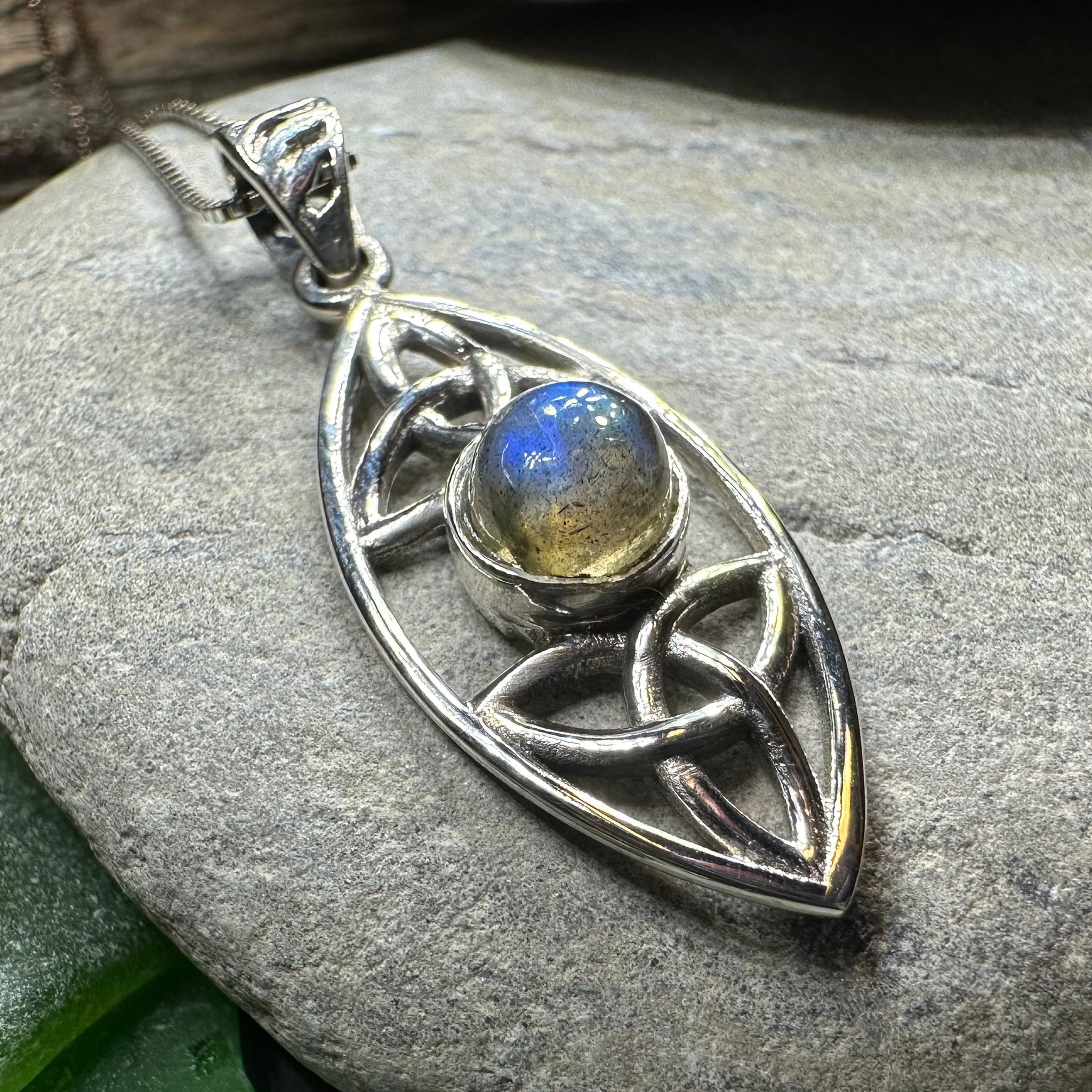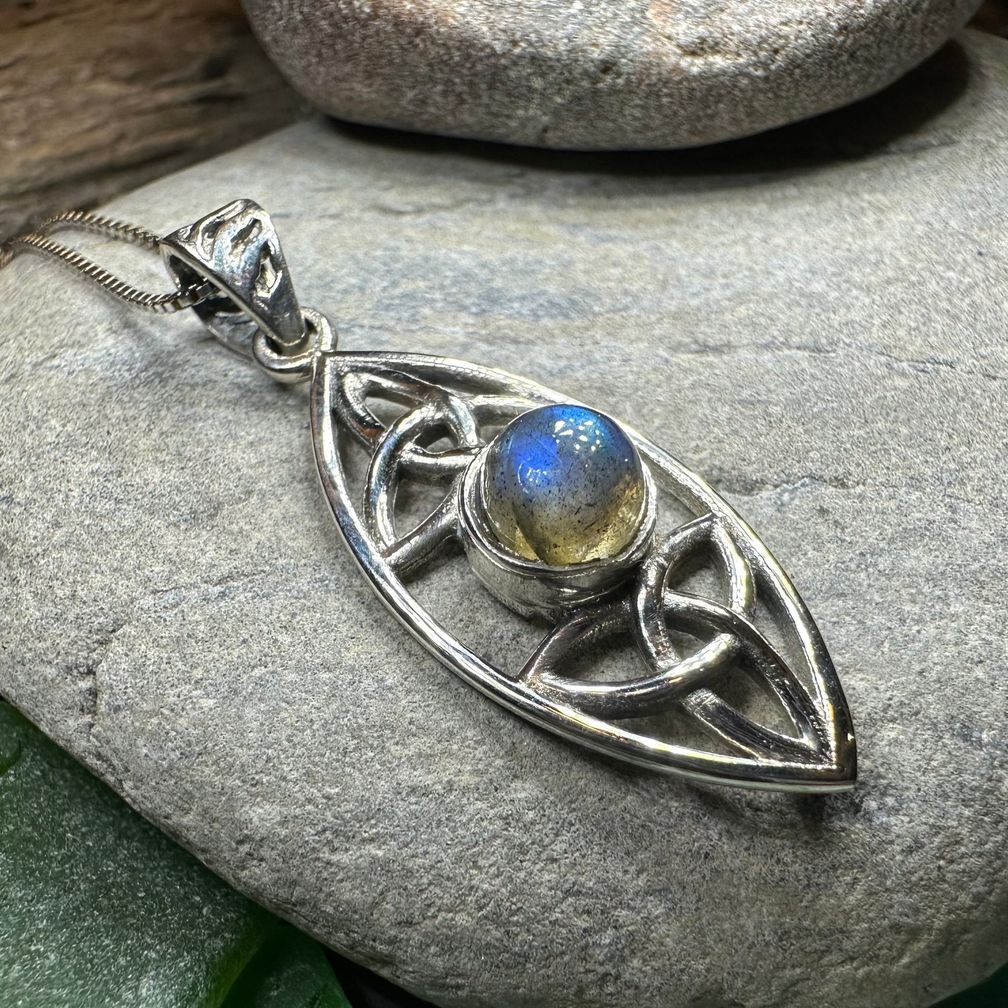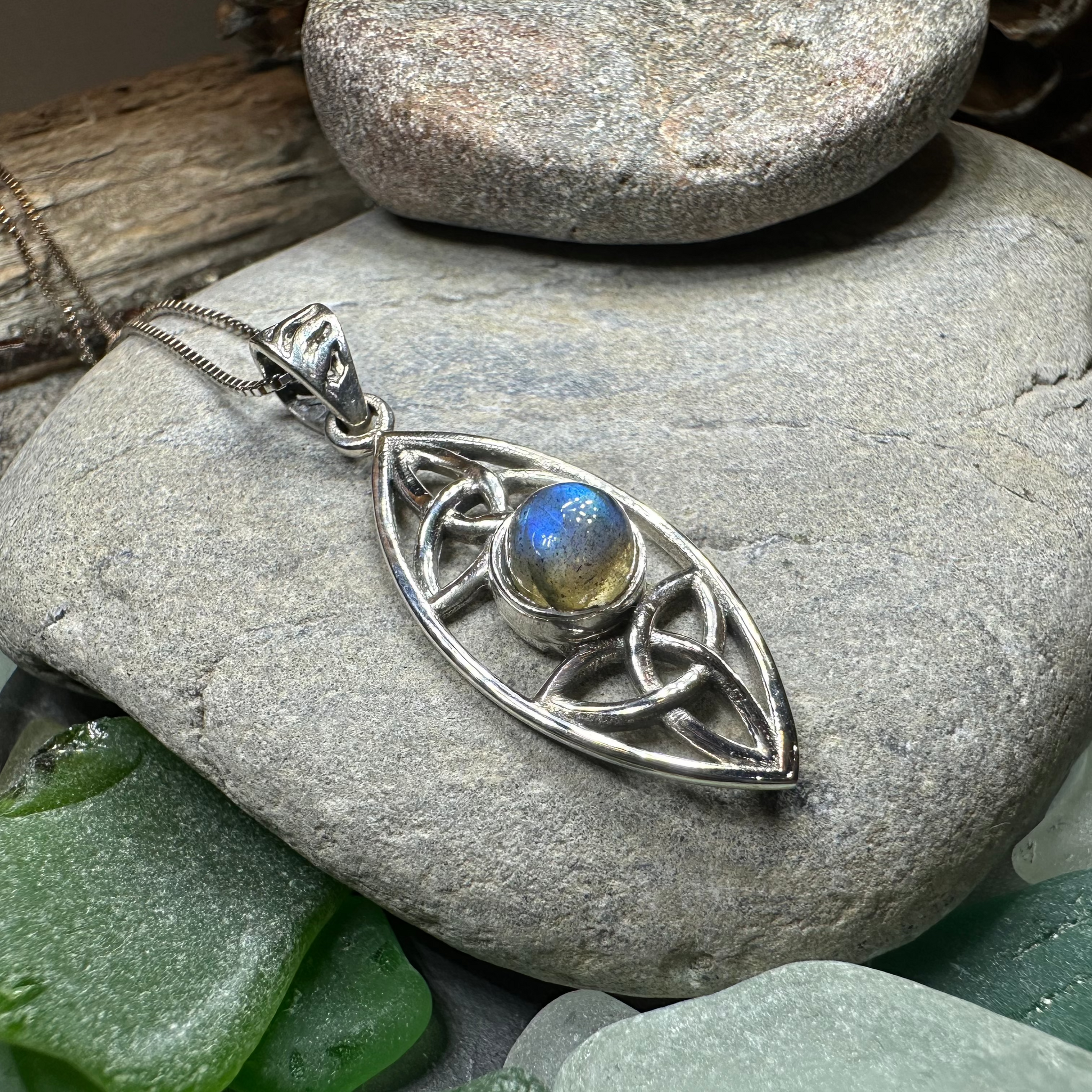 This traditional Celtic trinity knot has a highly polished finish in solid sterling silver - comes on an 18" chain with your choice of authentic gemstone.