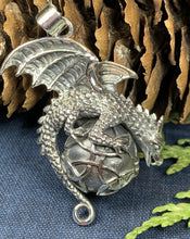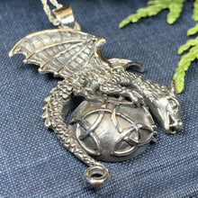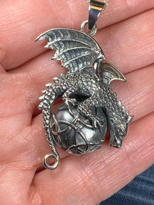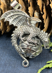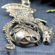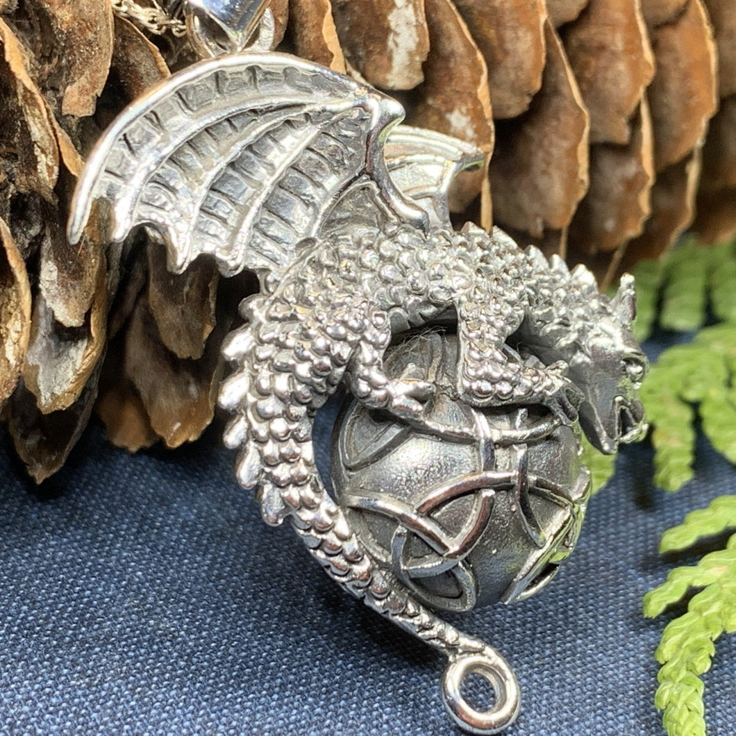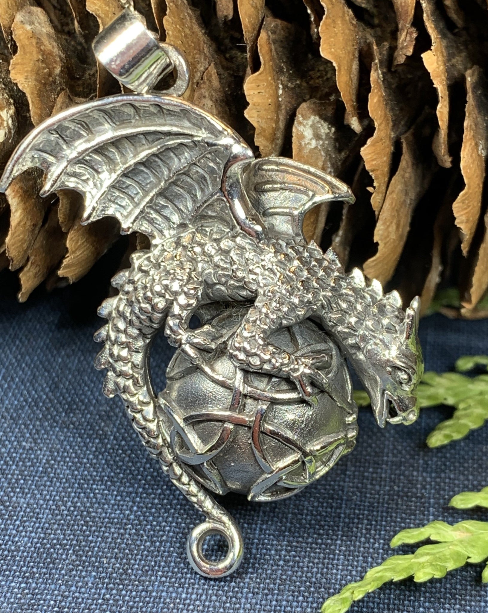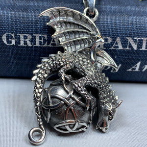 Made of solid sterling silver, this pendant features a beautifully detailed dragon with spread wings and raised claws, combined with an intricate knotwork-adorned Celtic moon.