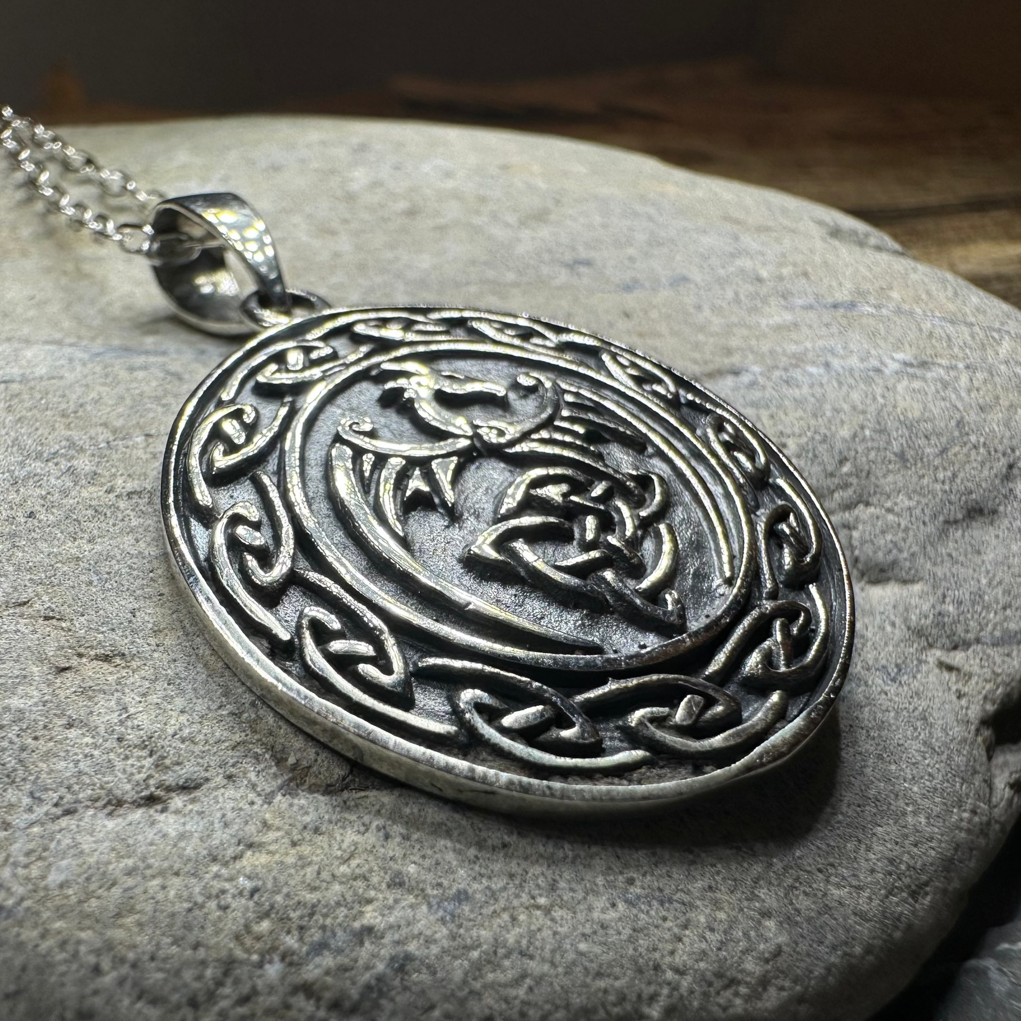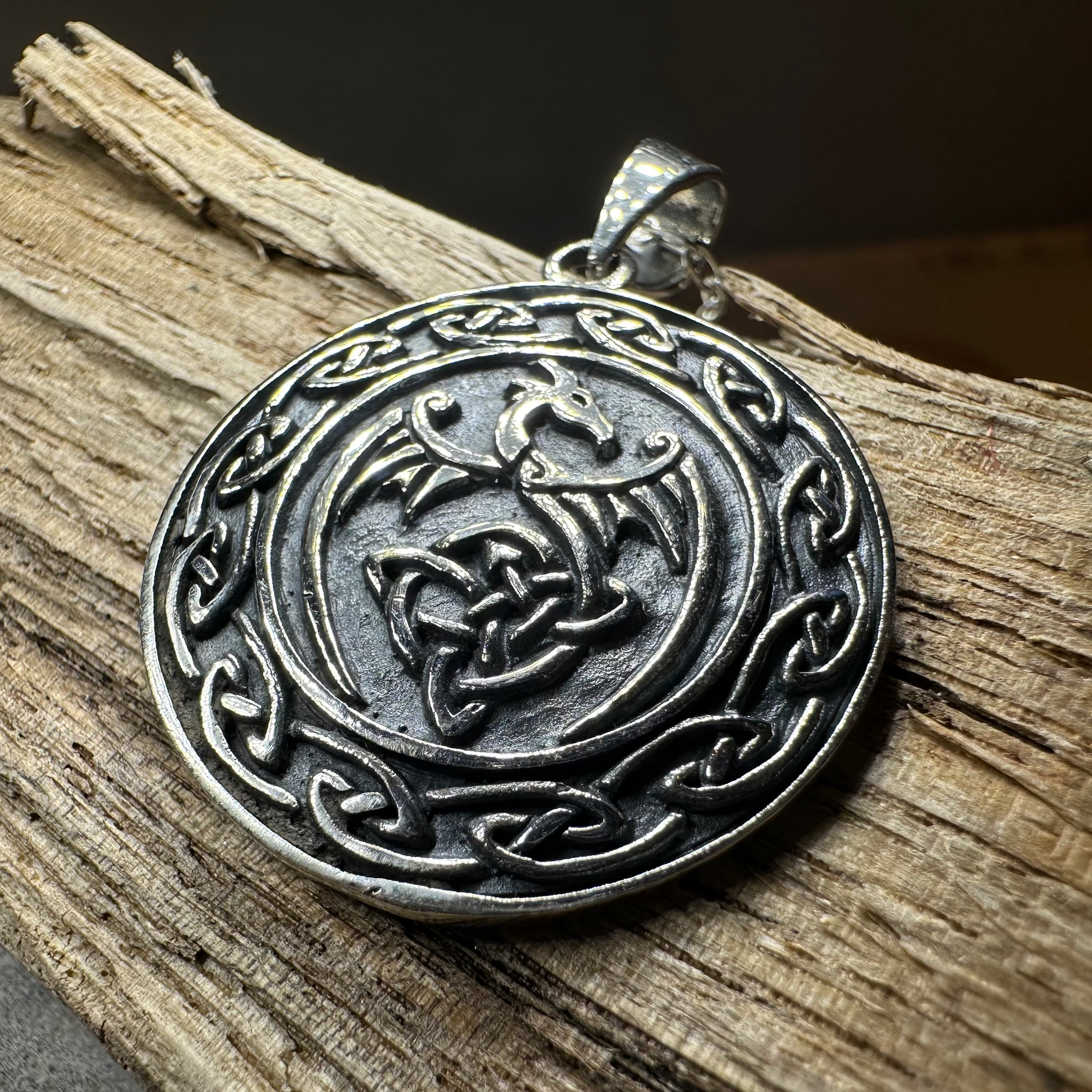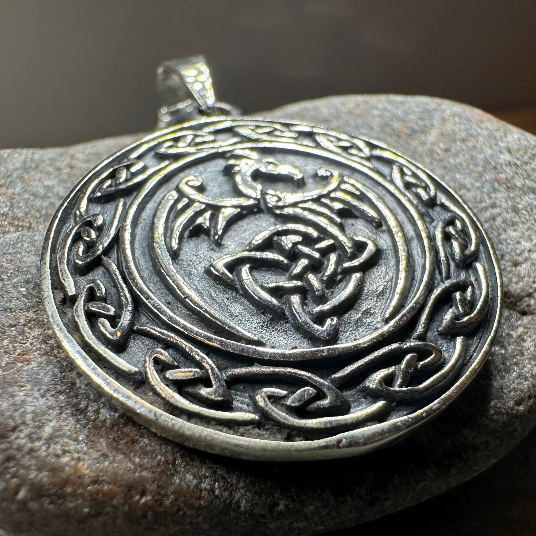 The antiqued background contrasts with the polished raised detail to create a piece that conveys to power of the dragon with the eternal allure of Celtic design.