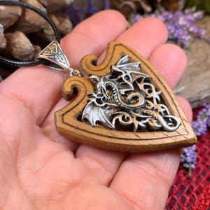 2" x 1 3/4" pendant on an 18" cord with 2" extender chain (20" total length)- solid hardwood and metal accents. All metal accents are lead and nickel free