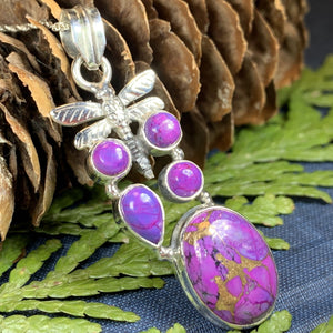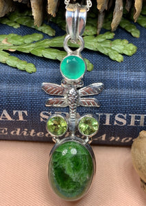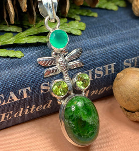 This beautiful Celtic Dragonfly necklace has beautiful green gemstones with a solid sterling silver dragonfly and setting. Rich green chrome diopside gemstone combined with peridot and chalcedony that surround the dragonfly's wings to create an eye-catching design for your loved one!