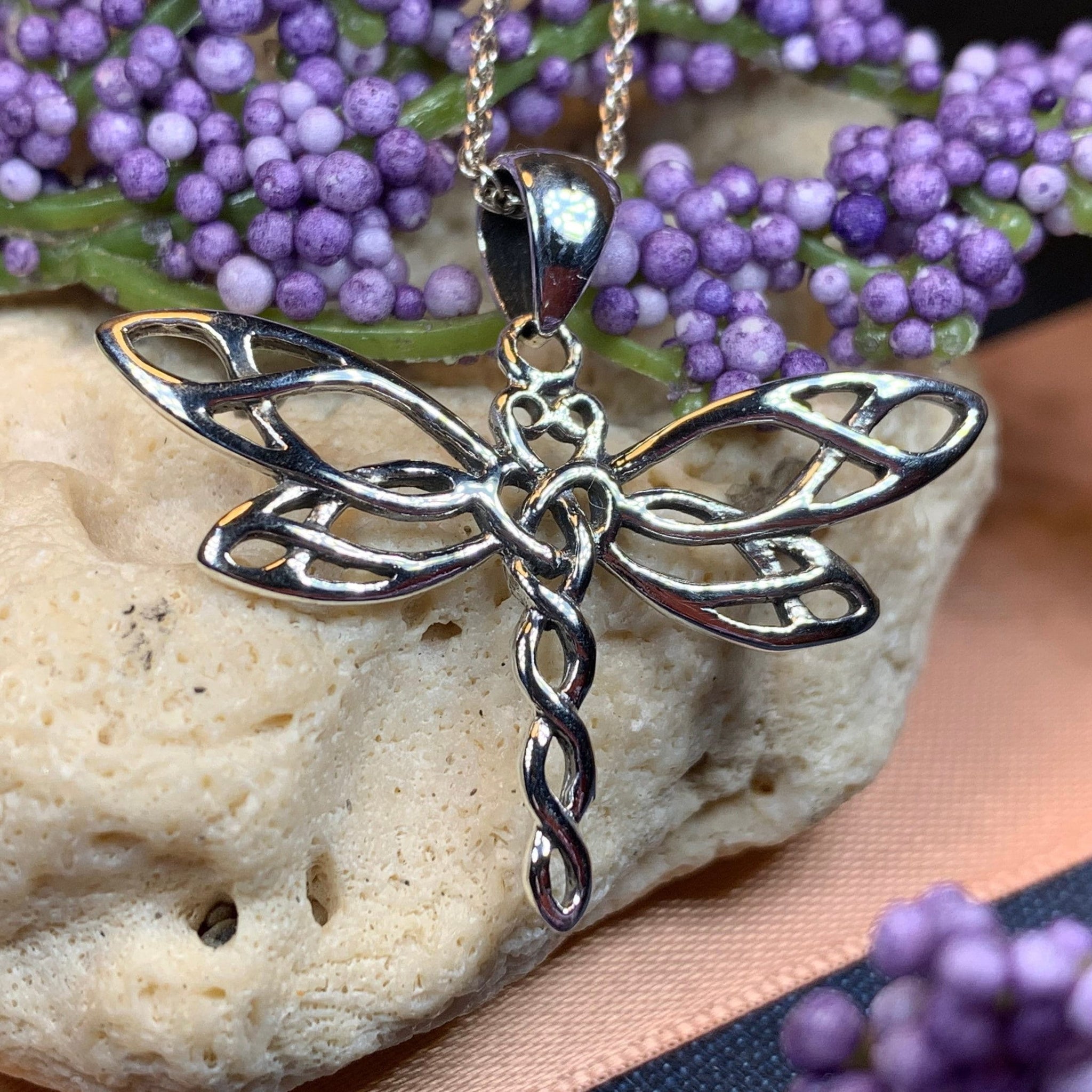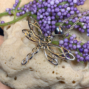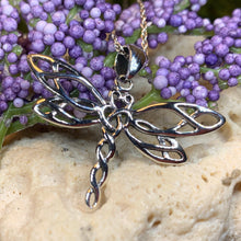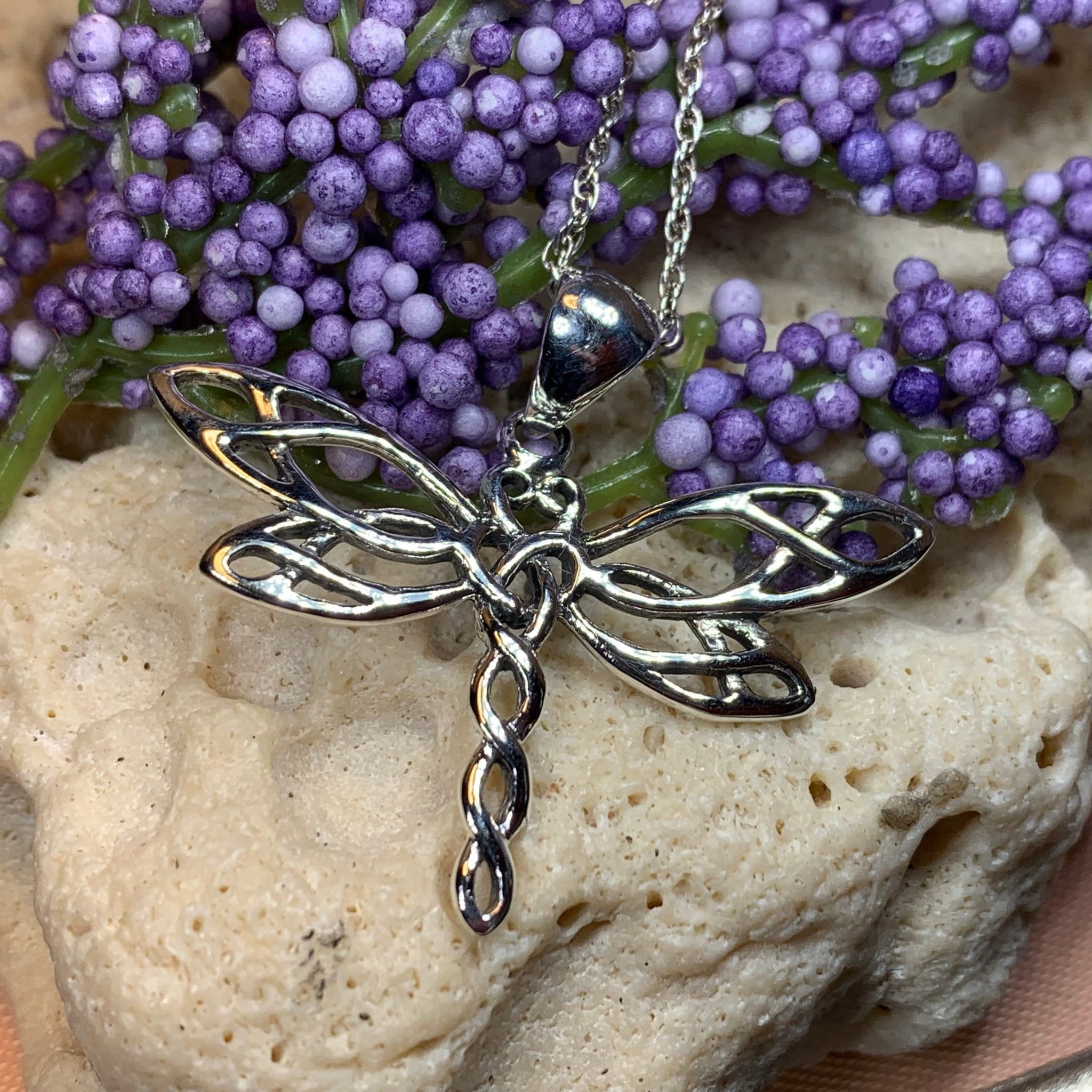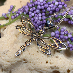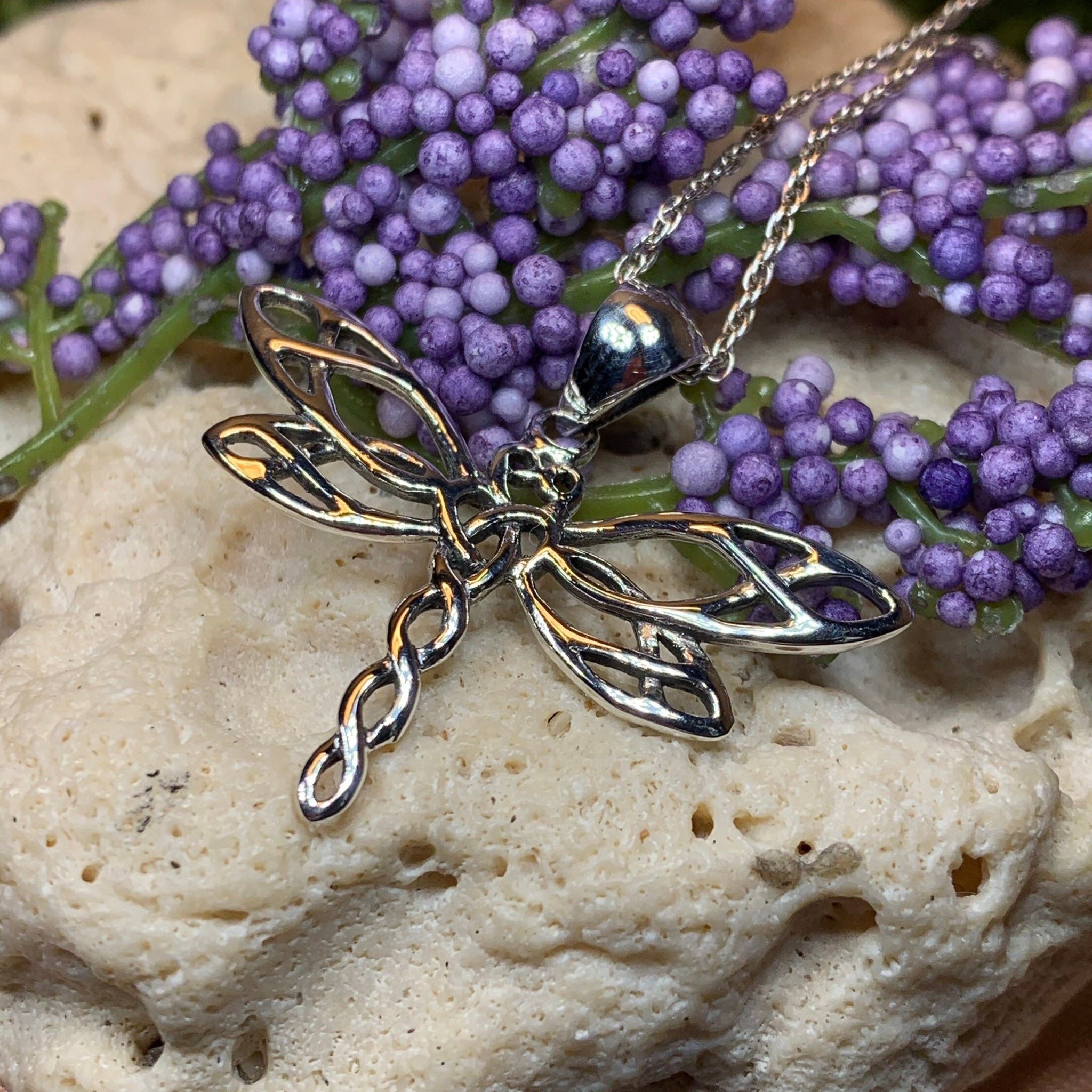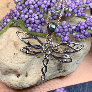 A solid pewter dragonfly created as a Celtic Knot measuring 1 1/2" x 1" - on a 20" chain with lobster claw clasp.
