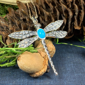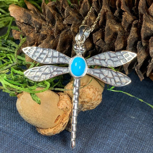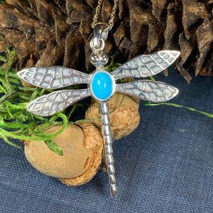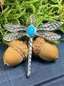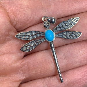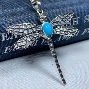 Solid Sterling Silver Dragonfly Pendant with natural turquoise gemstone on an 18" chain.