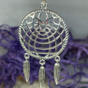 This Dreamcathcer pendant is an artful rendition of an ancient Native American symbol - incorporating the netting of the dreamcatcher in sterling silver with three detailed sterling silver feathers hanging from the dreamcatcher.