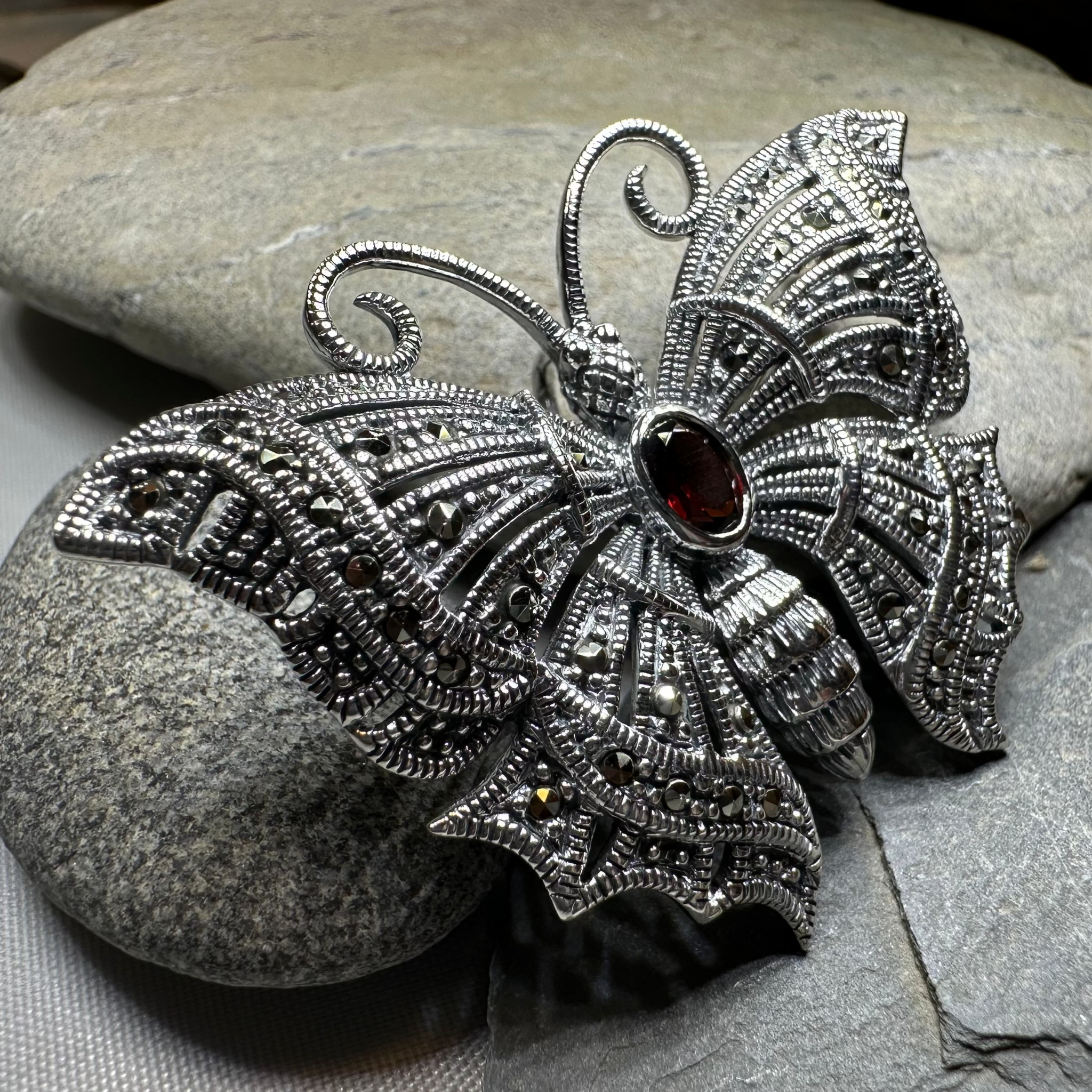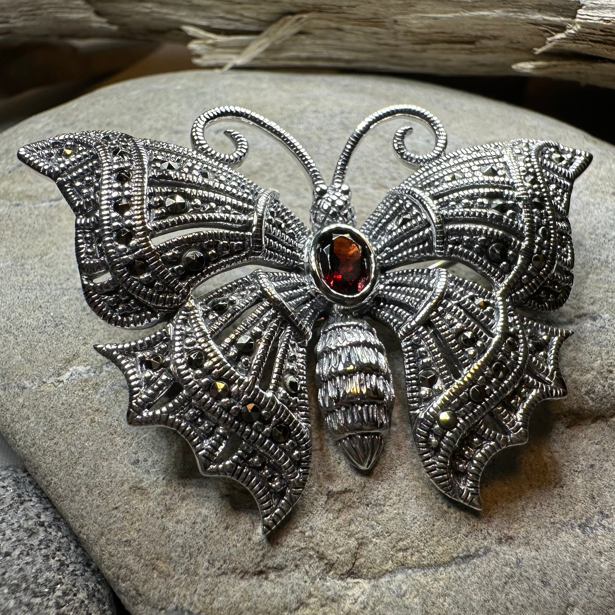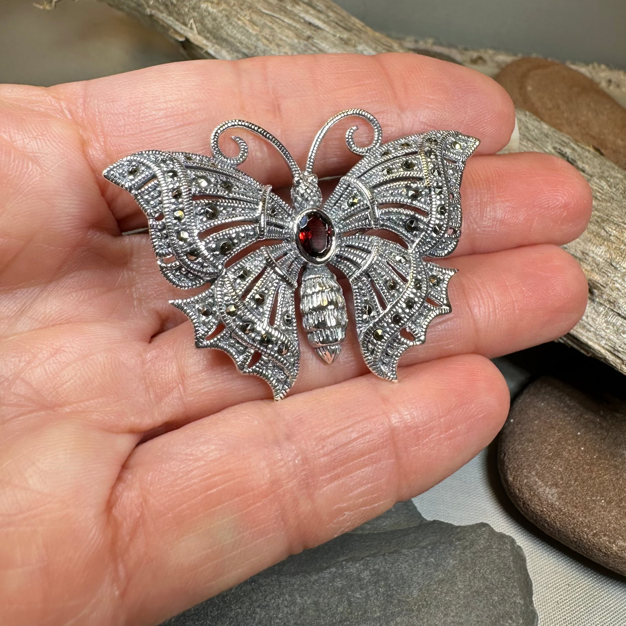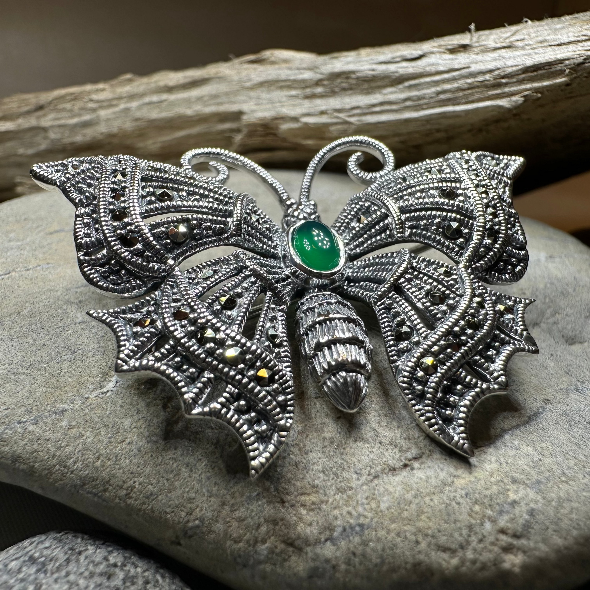 An attractive sterling silver Butterfly Brooch, using a traditional design featuring the classic butterfly design. The lovely, rich color of the center gemstone - red garnet or green agate - make this beautiful brooch a special gift.