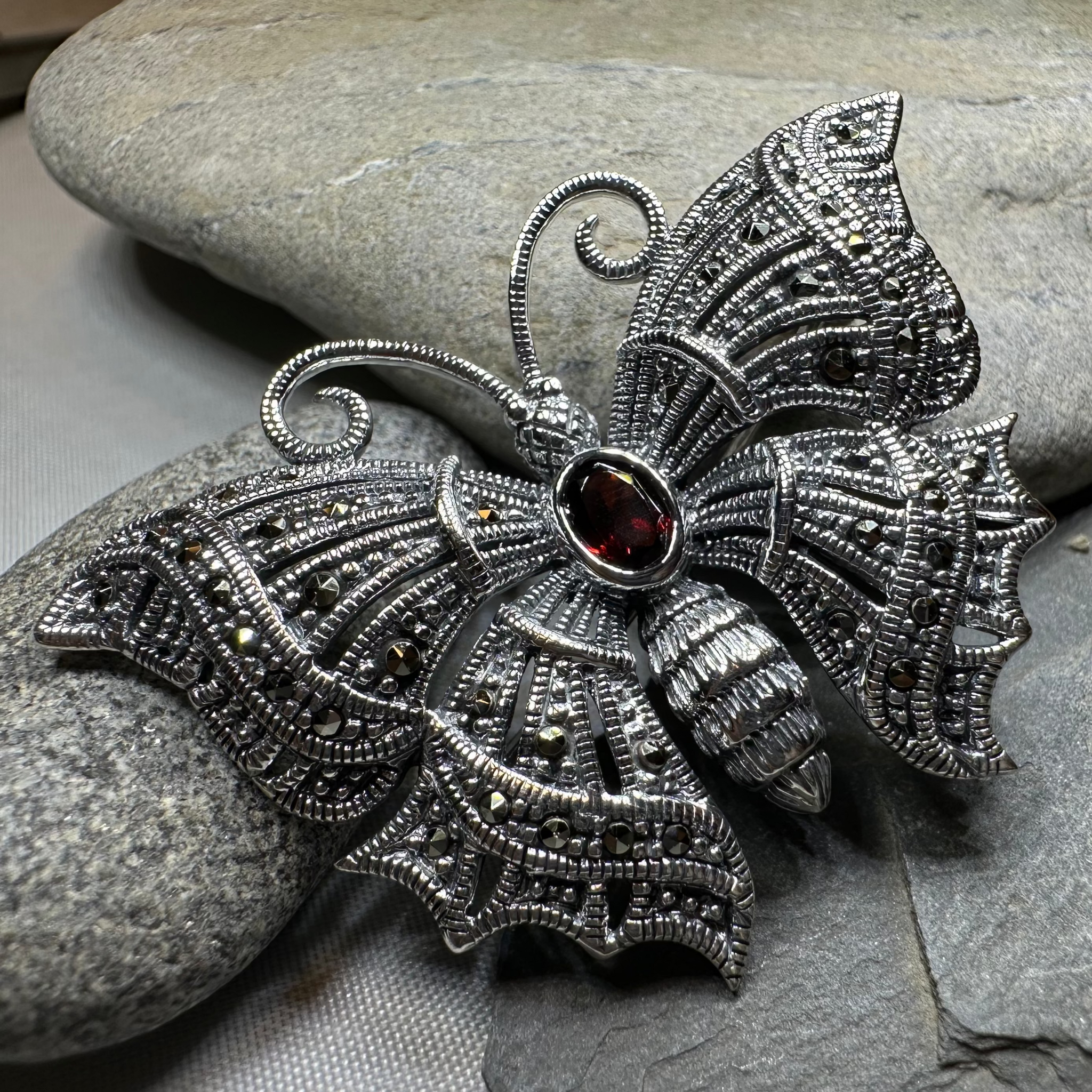 Solid Sterling Silver with sparkling marcasite and center gemstone of your choice.
