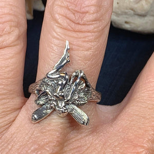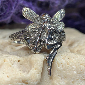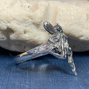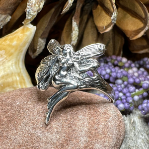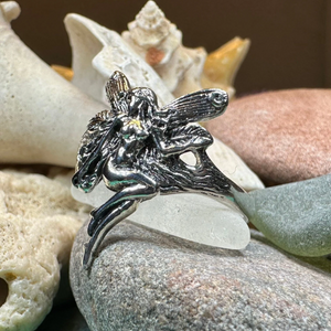 A unique fairy ring in solid sterling silver that shows the graceful lines of the fairy and the high polish of solid sterling silver. A beautiful ring for everyday wear - solid sterling silver.