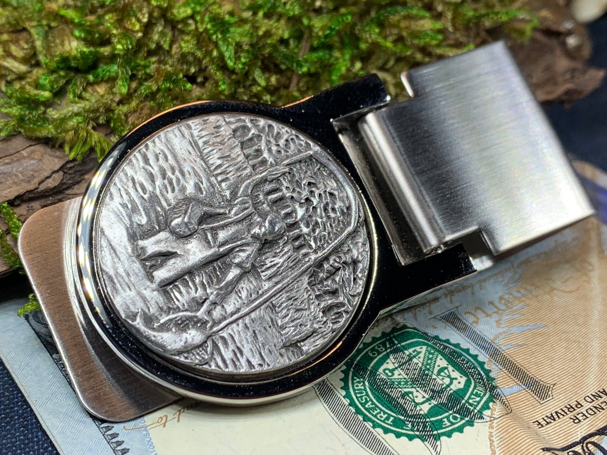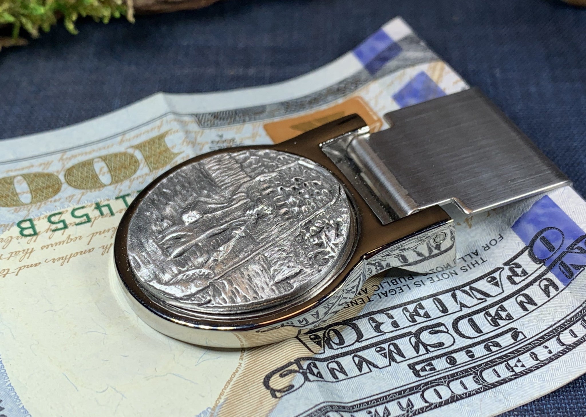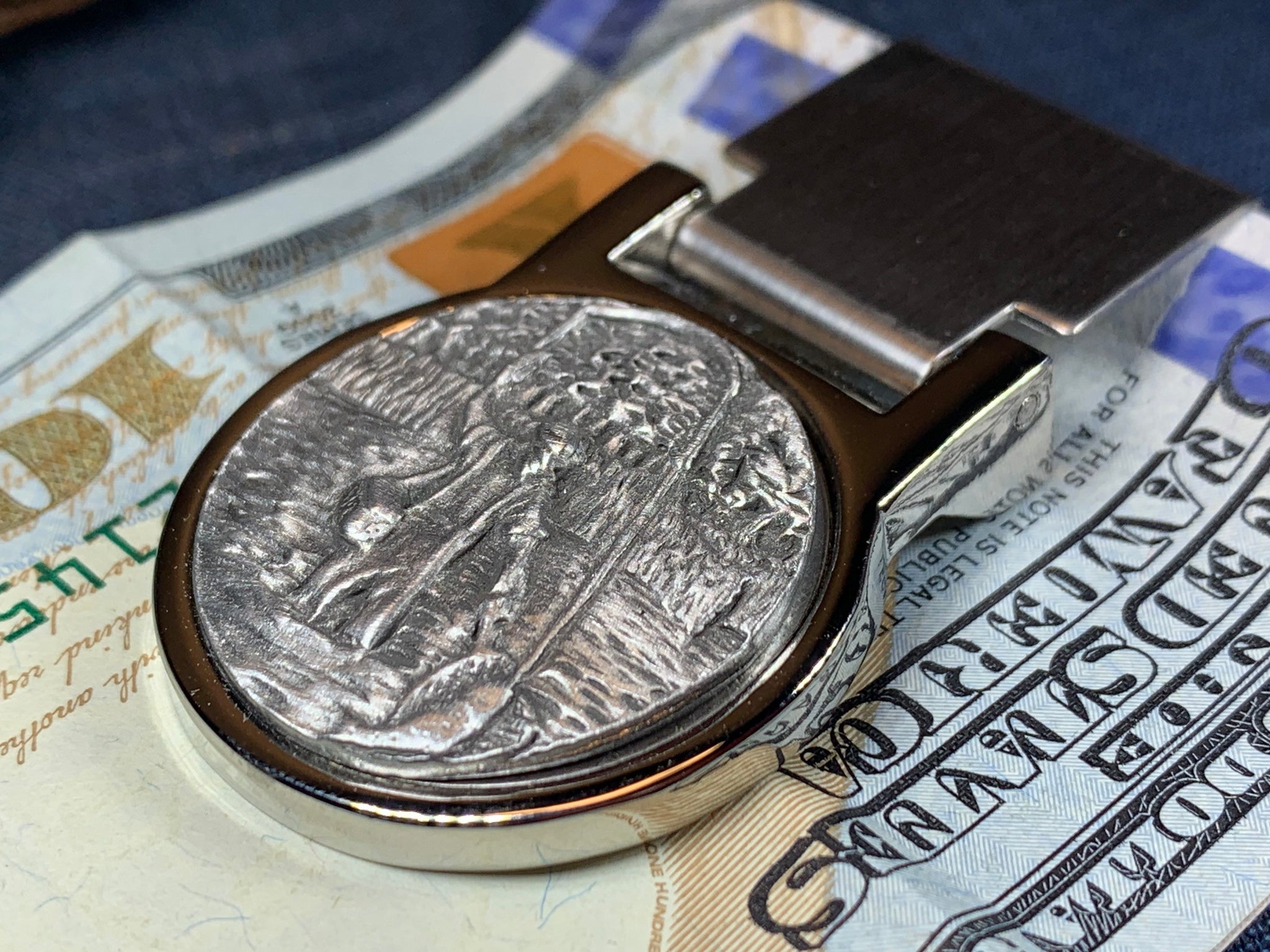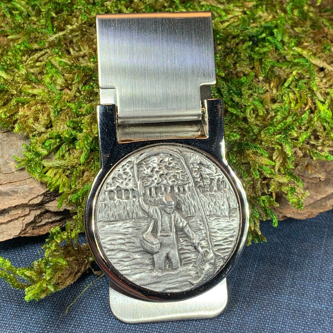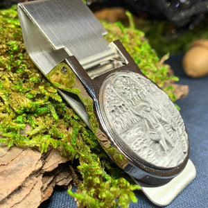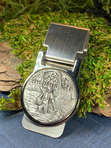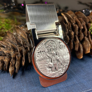 Beautiful stainless steel money clip with a matte finish and pewter focal piece. A classic Celtic Turtle design set into a pewter money clamp.