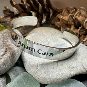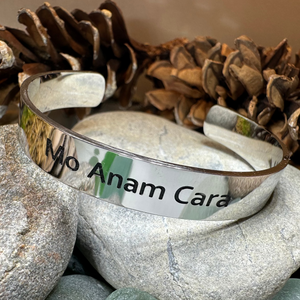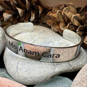 Solid Pewter Celtic Soulmate Cuff Bracelet with the Irish Gaelic words 'Mo ANAM CARA', translating to 'My SOULMATE' - or literally, "My Soul Friend".