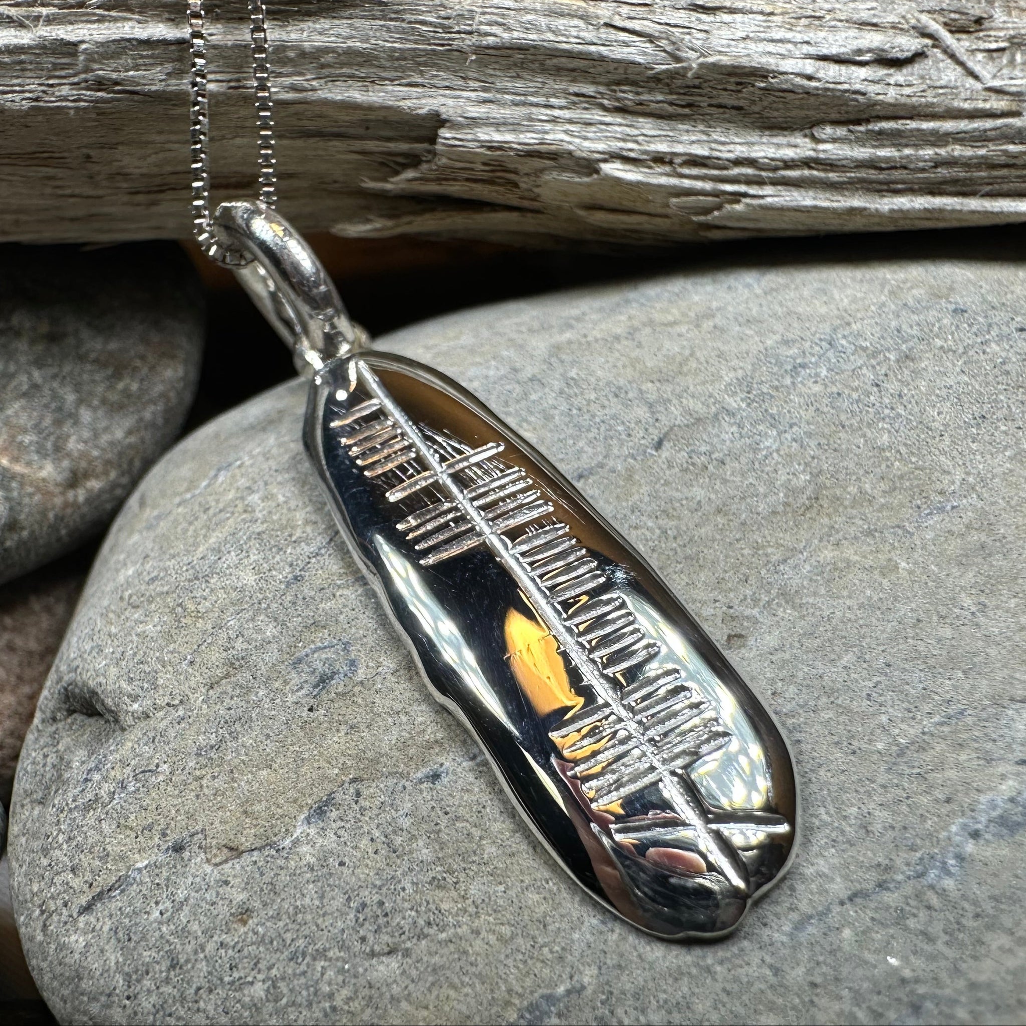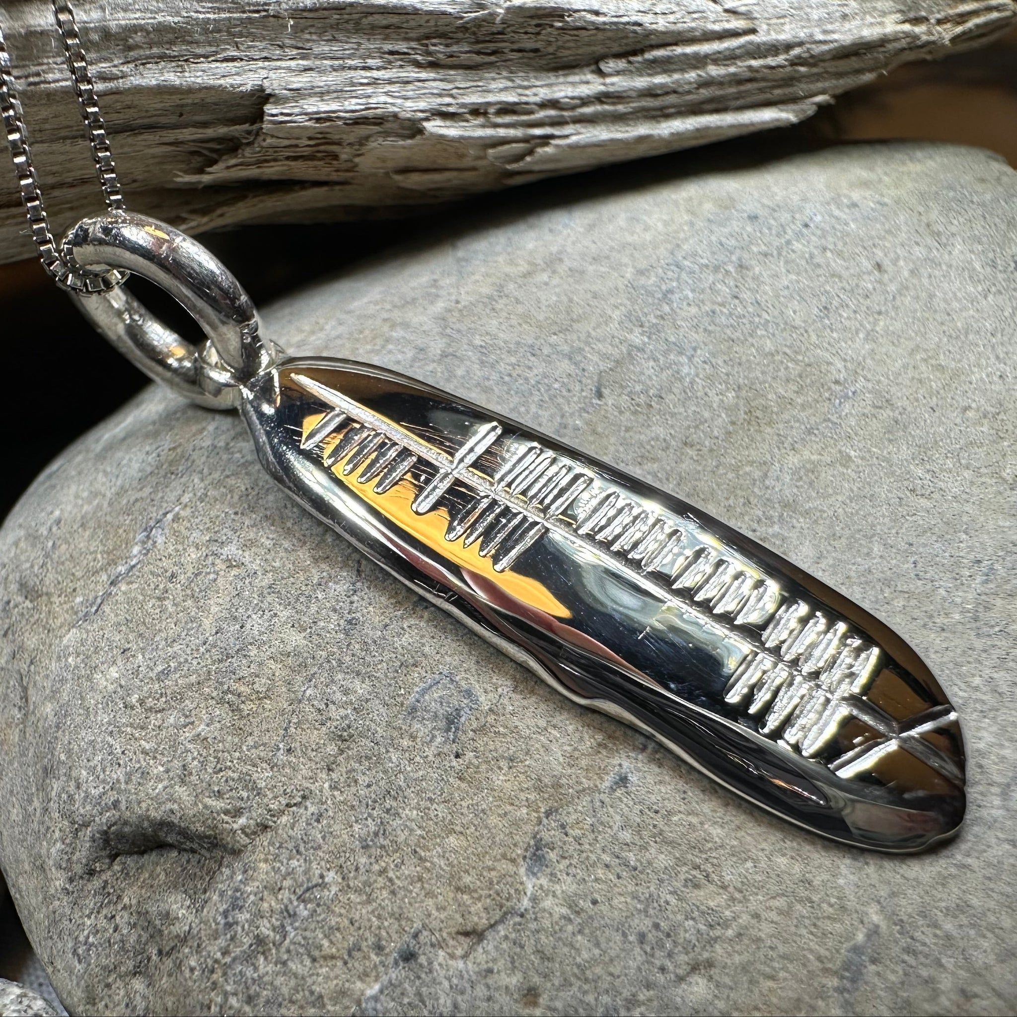 1 1/4" x 1/2" Solid Sterling Silver pendant comes on an 18" chain. Comes in a gift box with card from artist. 6.65 grams.