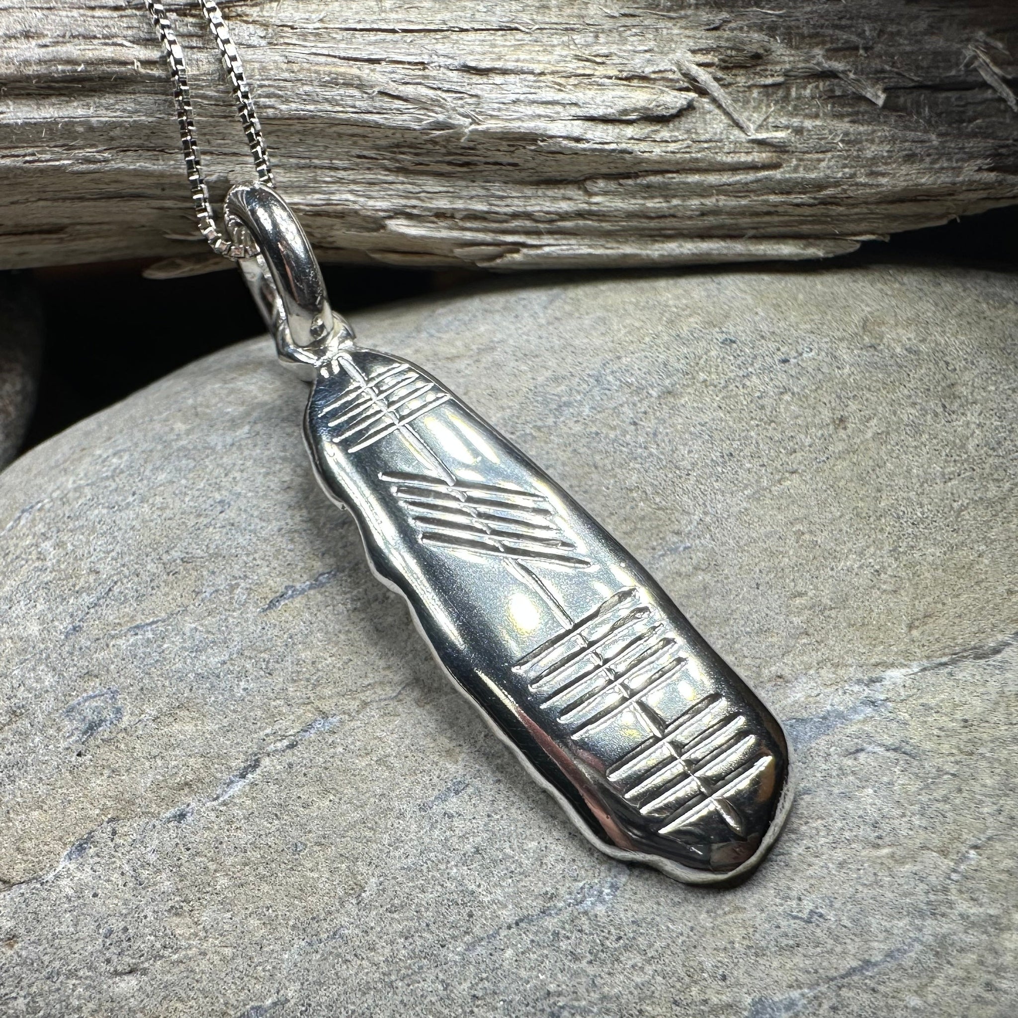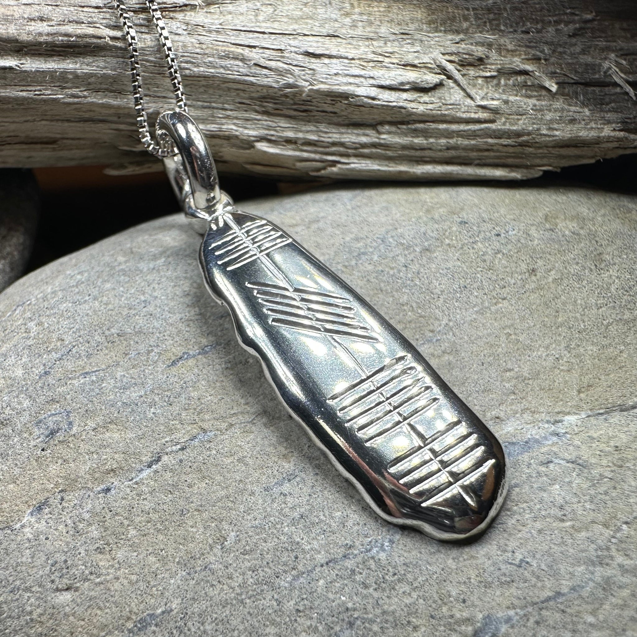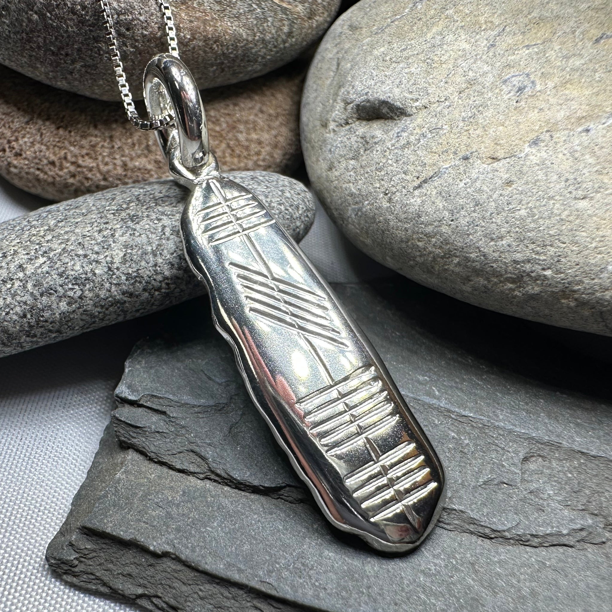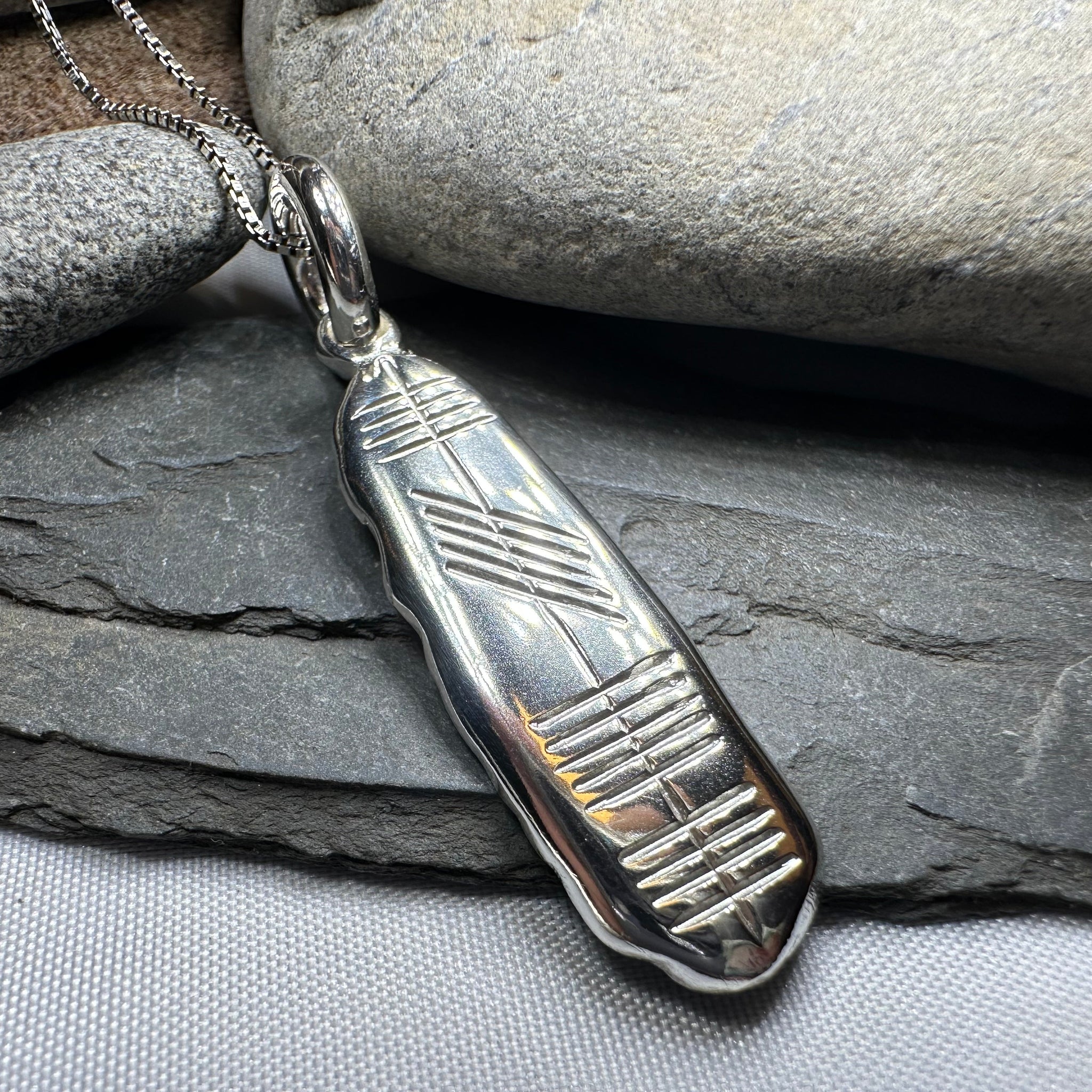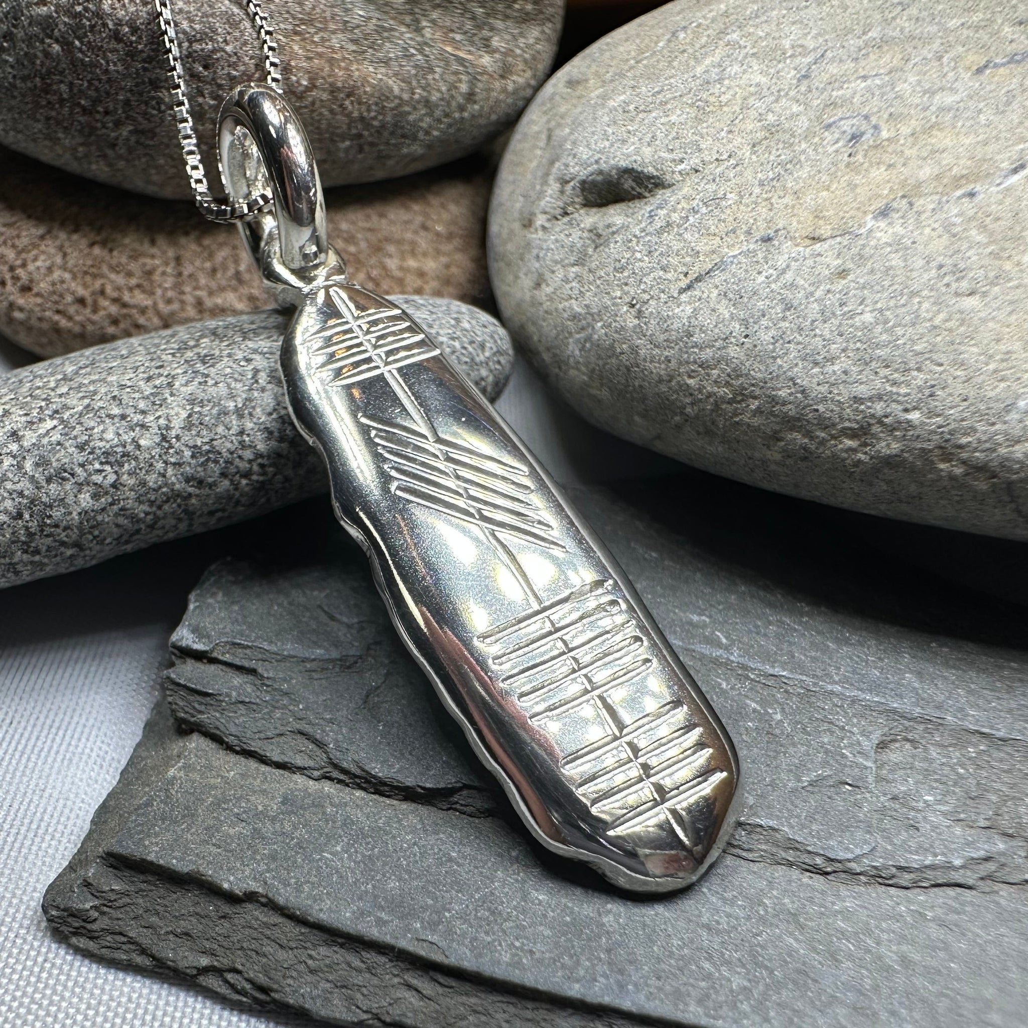 Ogham is an ancient Irish alphabet, consisting of twenty characters formed by parallel strokes on either side of or across a continuous line. This beautiful sterling silver pendant spells the word "Eire" in Ogham on one side - the Irish Gaelic word for "Ireland". A special gift that combines the two ancient languages of Ireland in meaningful way.
