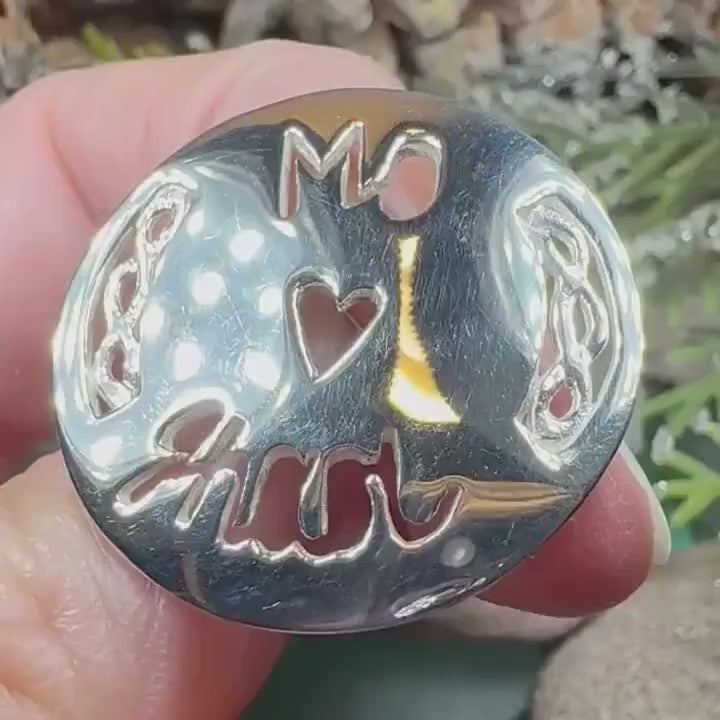 1 1/4" x 1 1/4" Brooch with the Scottish Gaelic phrase 'Mo Ghaol' - "My Love" in solid sterling silver.