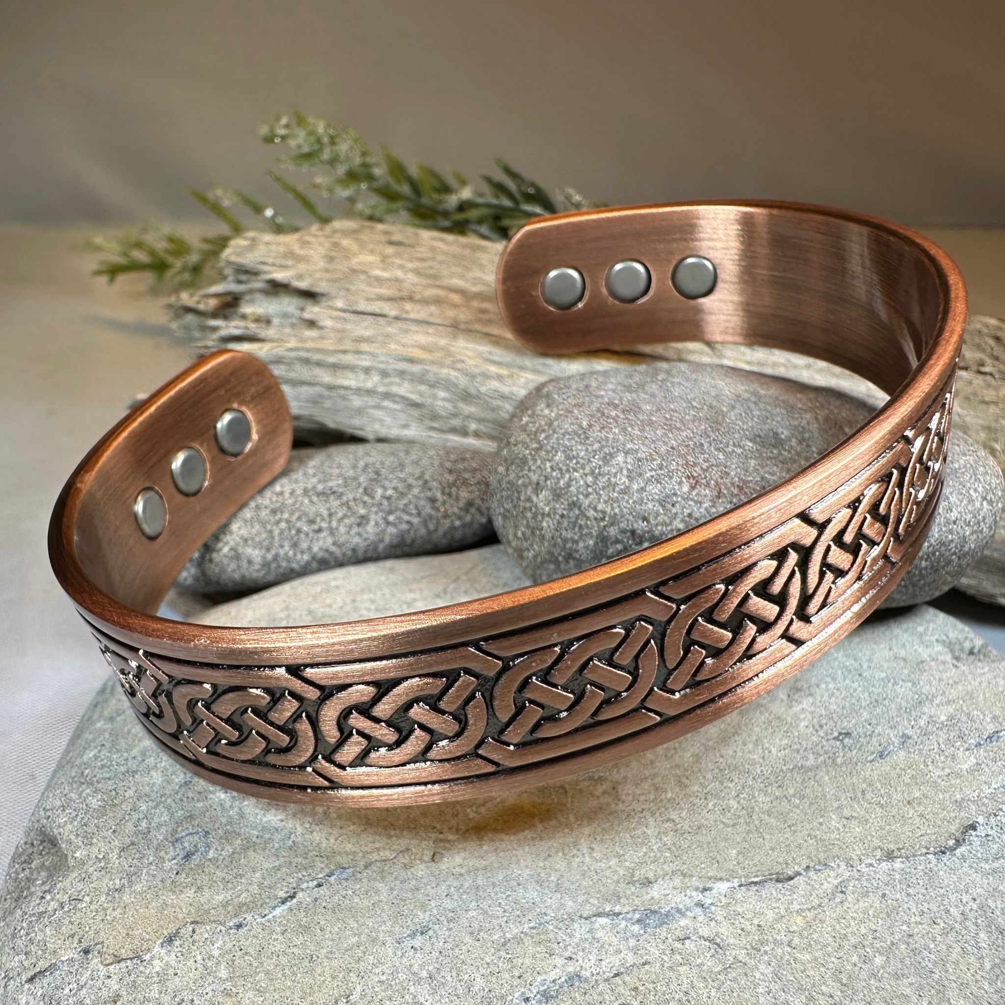 This bangle is embraced on both sides by a Celtic knot work pattern with six magnets set in the ends of the bracelet. Made of heavy, solid copper that will never tarnish and designed to last a lifetime. A beautiful gift!