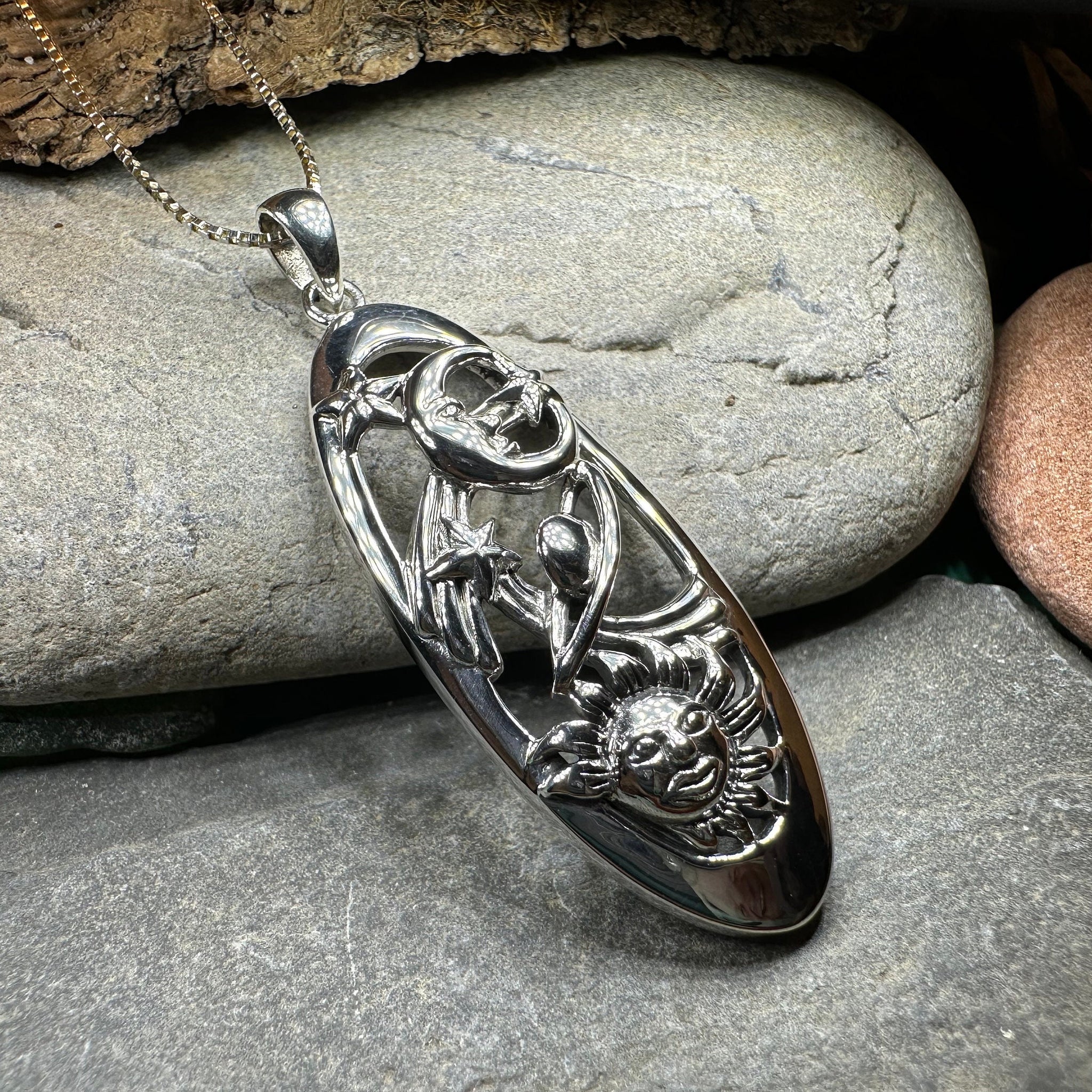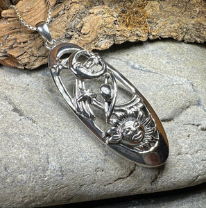 This large oval pendant is adorned with a crescent moon , smiling sun, ringed planet and star - all flowing through the milky way. a lovely representation of the universe for any lover of astronomy.