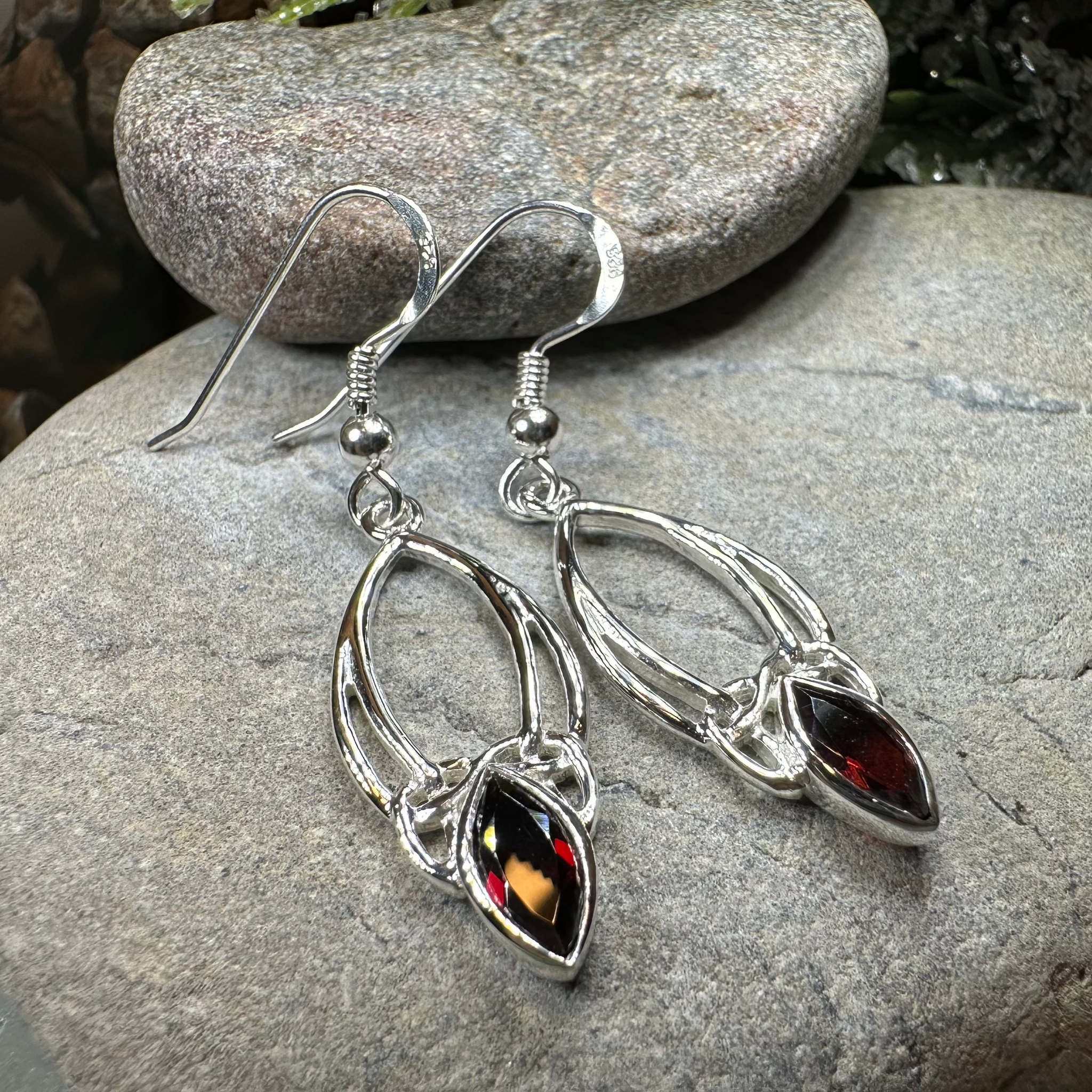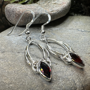 Beautiful Solid Sterling Silver Celtic Trinity Knot earrings- a symbol of lasting life and love - with a lovely faceted garnet (1 carat size on each earring) stone with vibrant color.