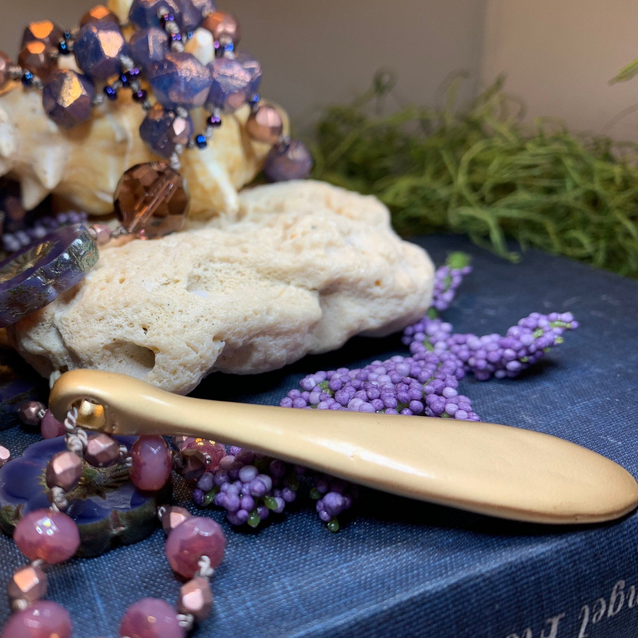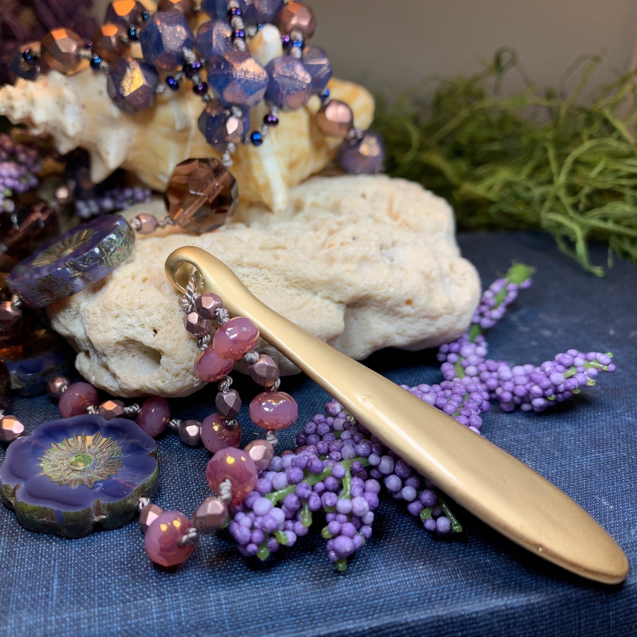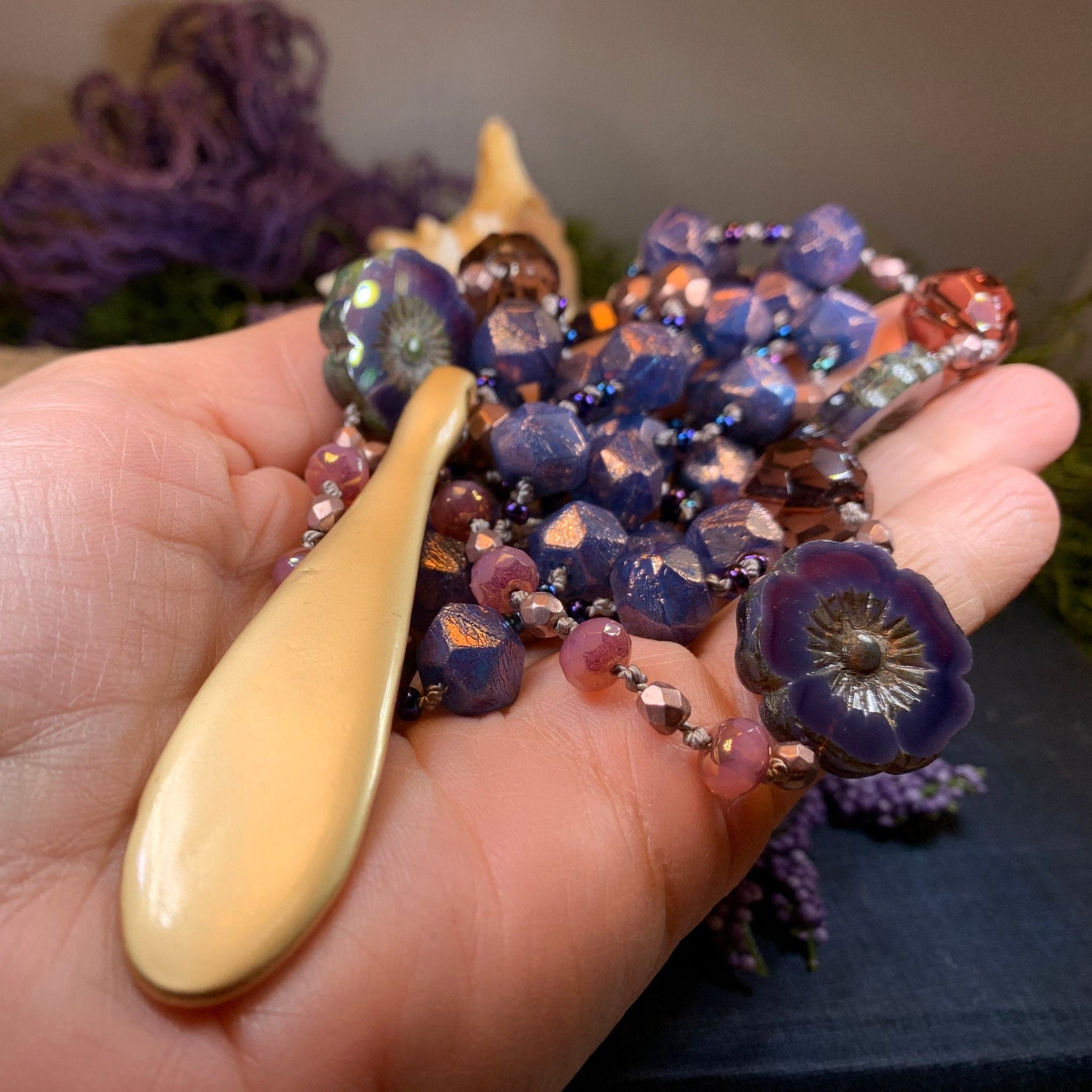 Beautiful and rich colors that remind me of the beautiful Gibson girl: purple, rose-gold, lavender, blue, pink with touches of gold. An organic matte finish pendant, Czech pressed glass beads, large floral focal beads, crystal seed beads, and swarovski crystal give this necklace a fun and flirty look!