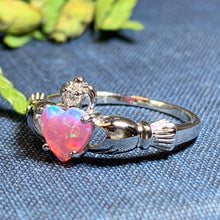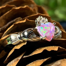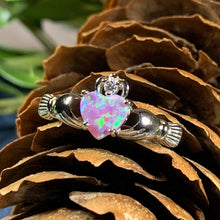 A unique design combining the traditional elements of the Claddagh with Celtic knot work - sterling silver with a heart shaped lab-created pink opal.