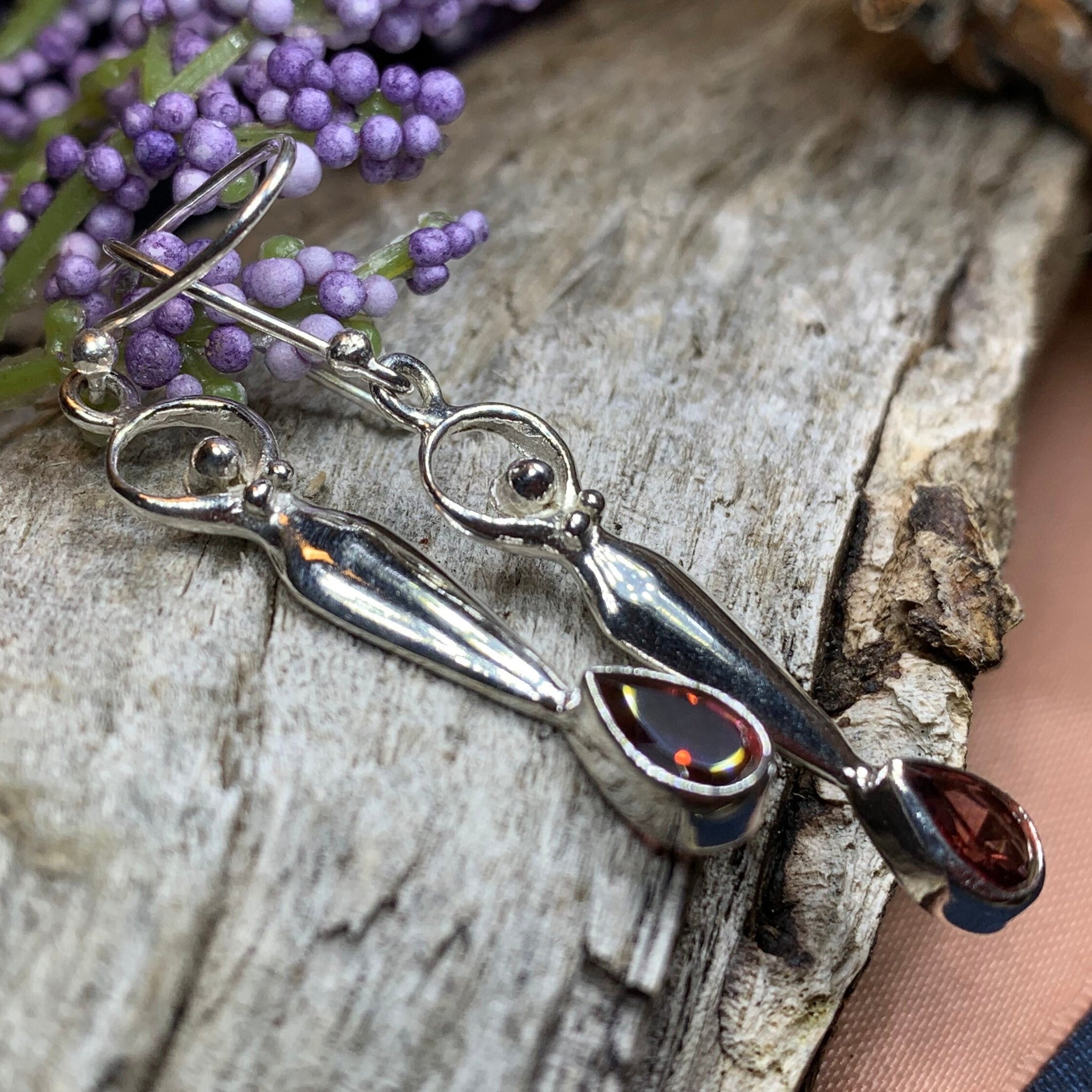 This Celtic Goddess is adorned with Celtic sprial accents and a one carat Grade AAA garnet or amethyst gemstone in each earring - an artful rendition of an ancient goddess design.
