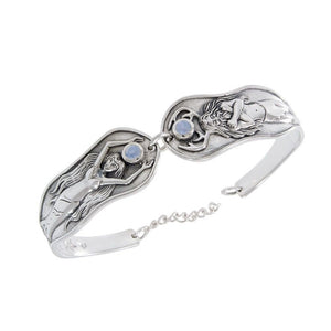 A fantasy of a bracelet with a elegant goddess with upraised arms and powerful god with stag horns...both images are adorned with a rainbow moonstone.