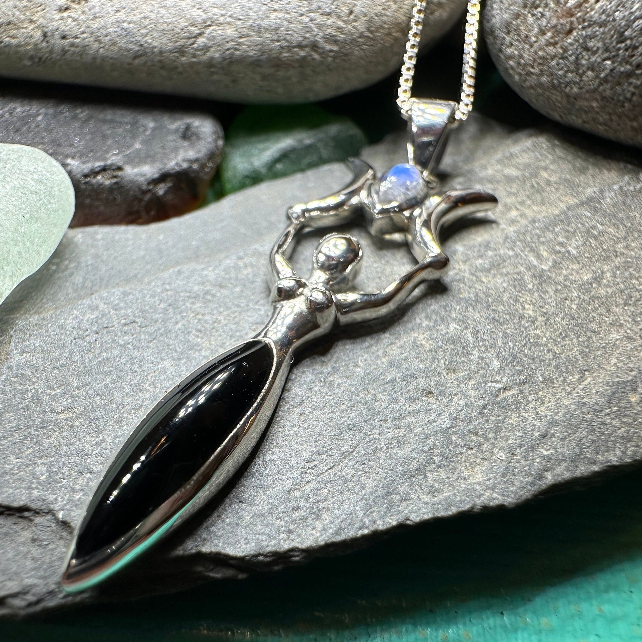 Solid Sterling Silver Goddess Pendant with authentic rainbow moonstone and black onyx inlay.