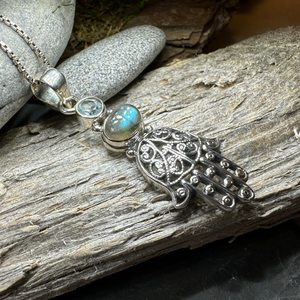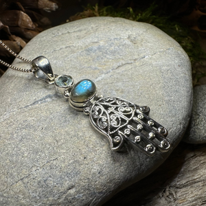 Beautiful Hamsa Hand Pendant in Solid Sterling Silver with blue labradorite & sky blue topaz gemstone- a symbol of lasting life and love - with beautiful Celtic knot work.