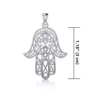 Beautiful Hamsa Hand Pendant in Solid Sterling Silver- a symbol of lasting life and love - with beautiful Celtic knot work. The knot work surrounds the the "eye" on the traditional Hamsa hand - believed to ward off negative energy and draw positive energy to the wearer. Beautiful and elegant - a great gift!