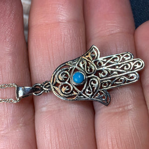Beautiful Hamsa Hand Pendant in Solid Sterling Silver with blue-green natural turquoise stone - a symbol of lasting life and love - with beautiful Celtic knot work.