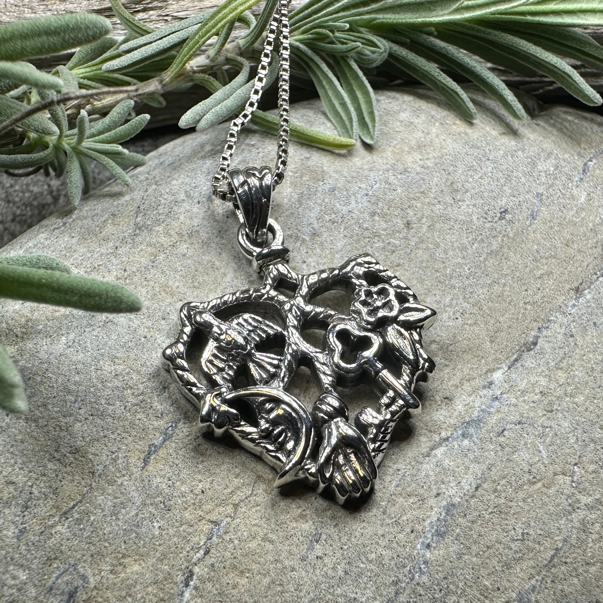 Solid sterling silver Heart Italian Cimaruta pendant with an 18" sterling silver chain.