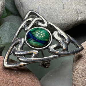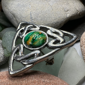 The elegant lines of this Celtic knot brooch are beautifully accented with a colorful hand created heather stone handmade in Scotland. A bold design that will catch the eye!