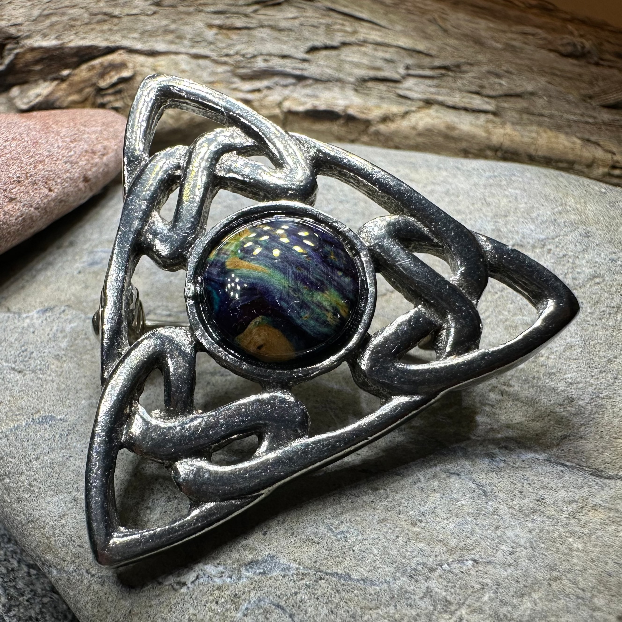 The elegant lines of this Celtic knot brooch are beautifully accented with a colorful hand created heather stone handmade in Scotland. A bold design that will catch the eye!