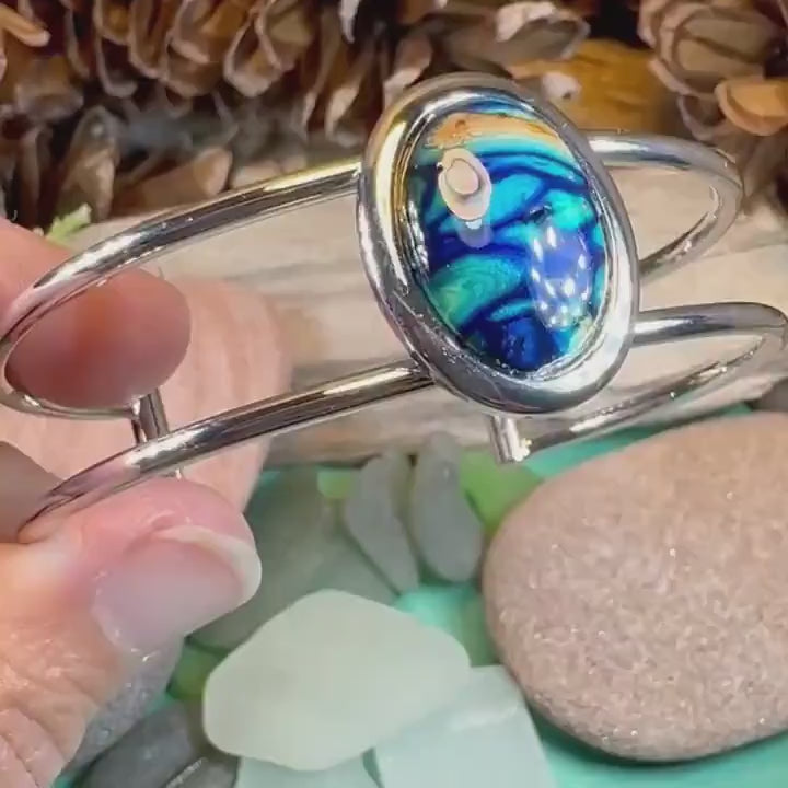 What an eye-catcher! This bracelet is perfect for the woman who loves beautiful color. This bracelet features a large 3/4 inch center stone created from Highland heather wood.