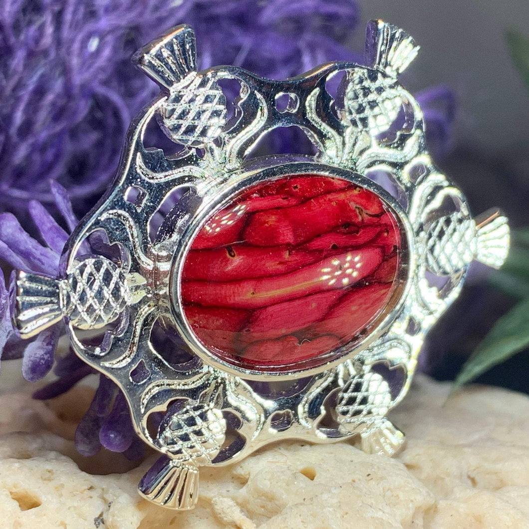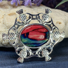 This unique and beautiful thistle brooch features a center stone created from Highland heather wood gathered in Scotland. The stems are collected in the Highlands, compressed into this unique material, and hand painted in the colors of the Highlands! A great way to celebrate Scotland and its natural beauty.
