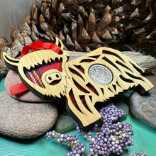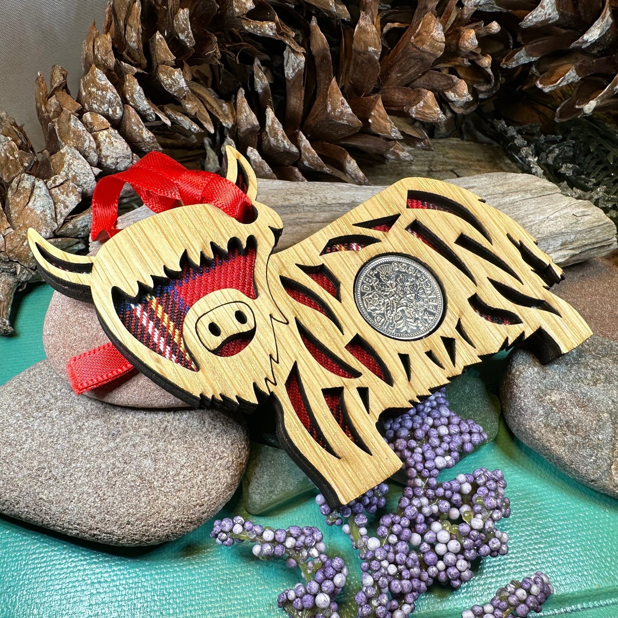 A fantastic Scotland themed gift! This spunky Highland Cow hanging wooden plaque with a lucky sixpence in the centre is a fantastic memorable gift!