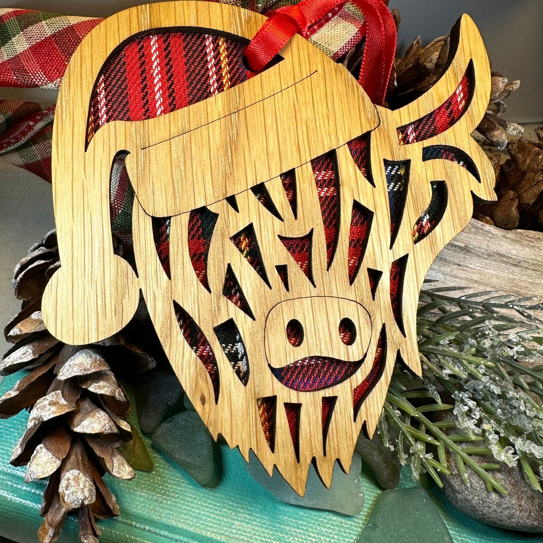 Tartan and oak wood Santa Highland Cow Ornament that will make a beautiful addition to your holiday decor!