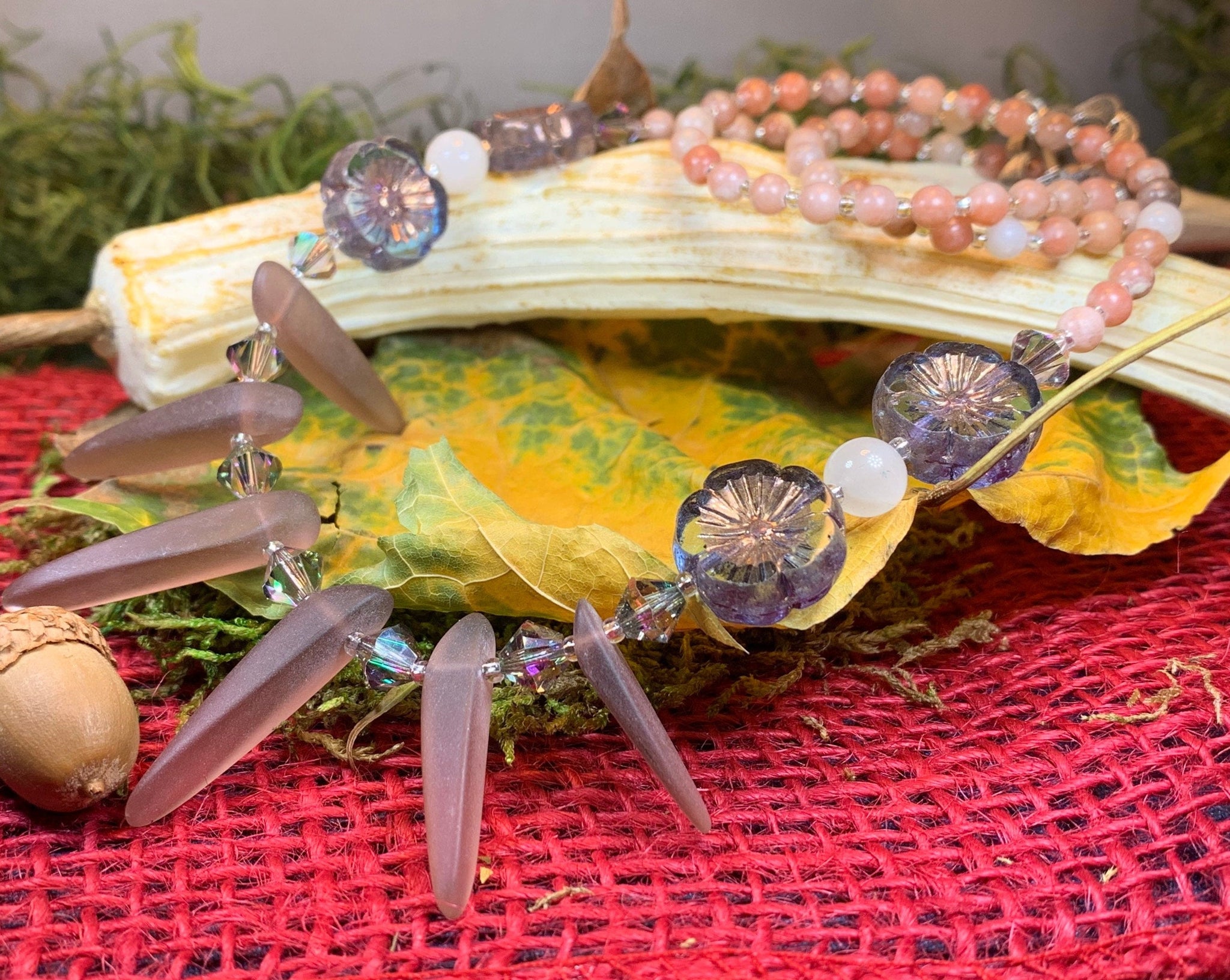 We wear jewelry to feel and look beautiful. I designed this necklace with this ideal in mind. Pulling from the colors of nature, the necklace is designed to celebrate the colors of a pastel Highland sunrise: pale purples, pinkish gray, and silver.