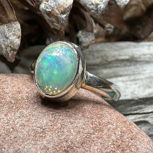 A unique design of a mystical authentic Ethiopian opal stone with colors of green, rose, orange and gold - a unique and feminine ring that is a reminder of the glorious misty colors of a sunset in the Highlands of Scotland - solid sterling silver.