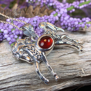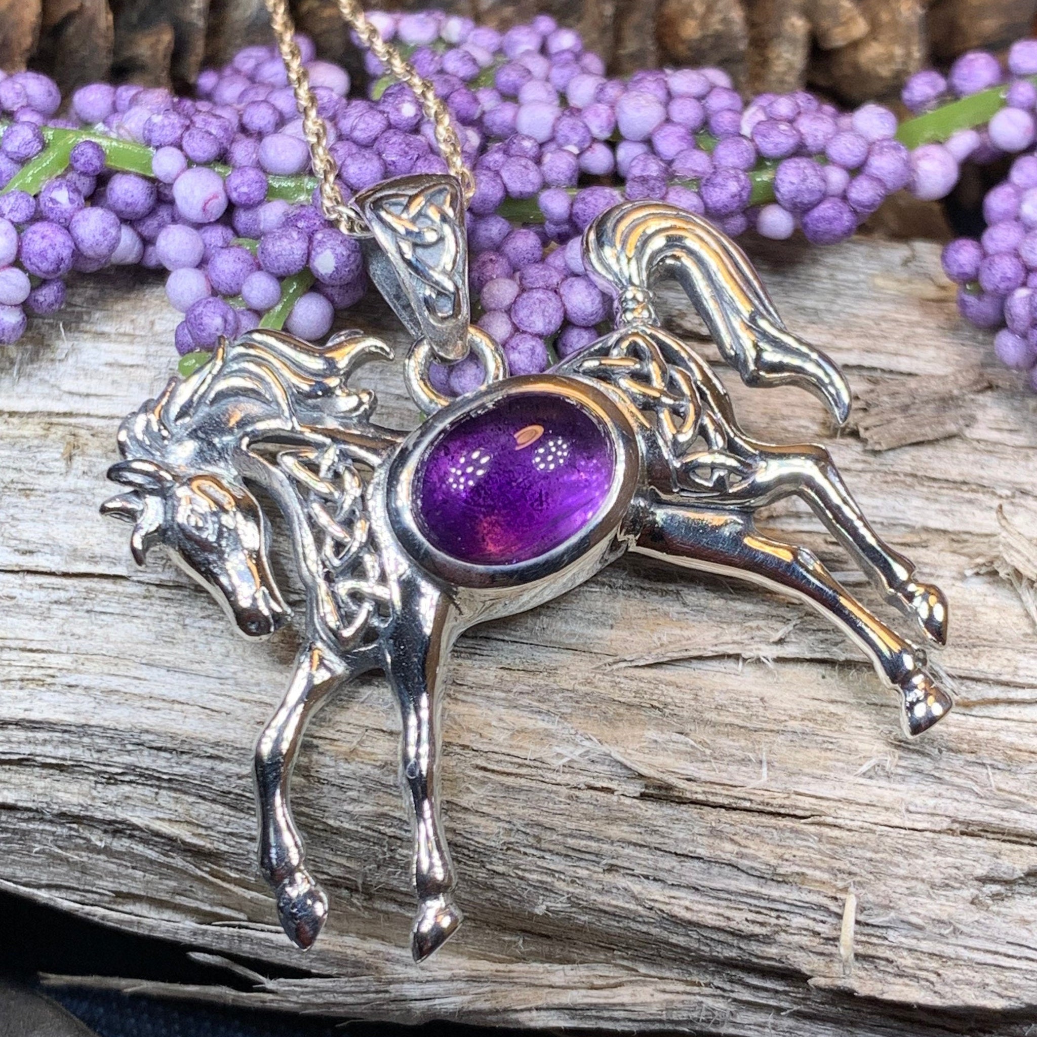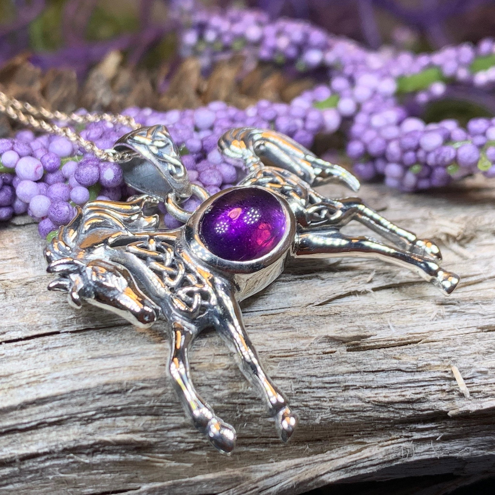 This beautiful sterling silver horse pendant comes on a sterling silver chain with a large, glowing gemstone that really sets this piece apart from the rest!