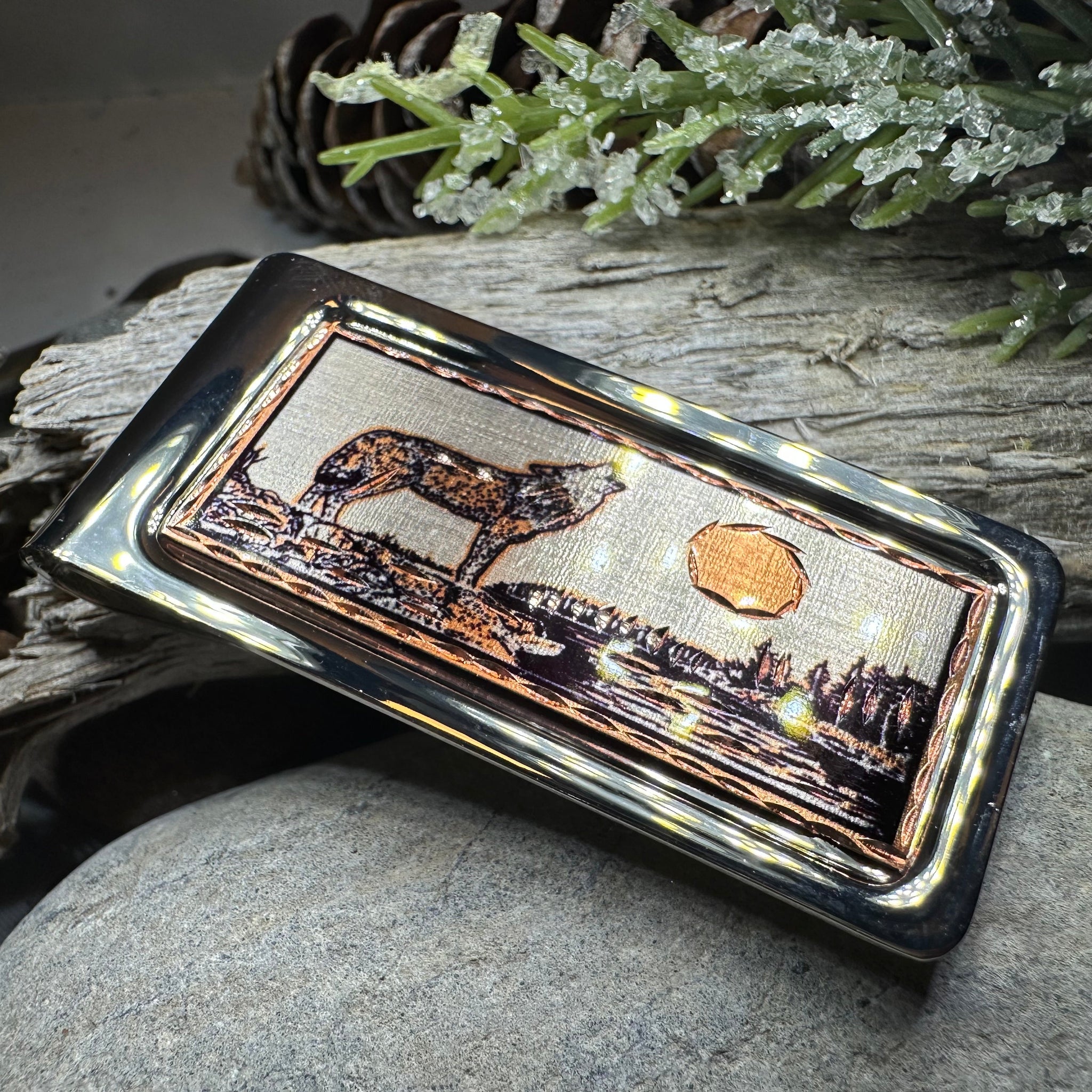 Beautiful stainless steel money clip with a matte finish and copper focal piece. A classic Howling Wolf design set into a beautiful money clamp.