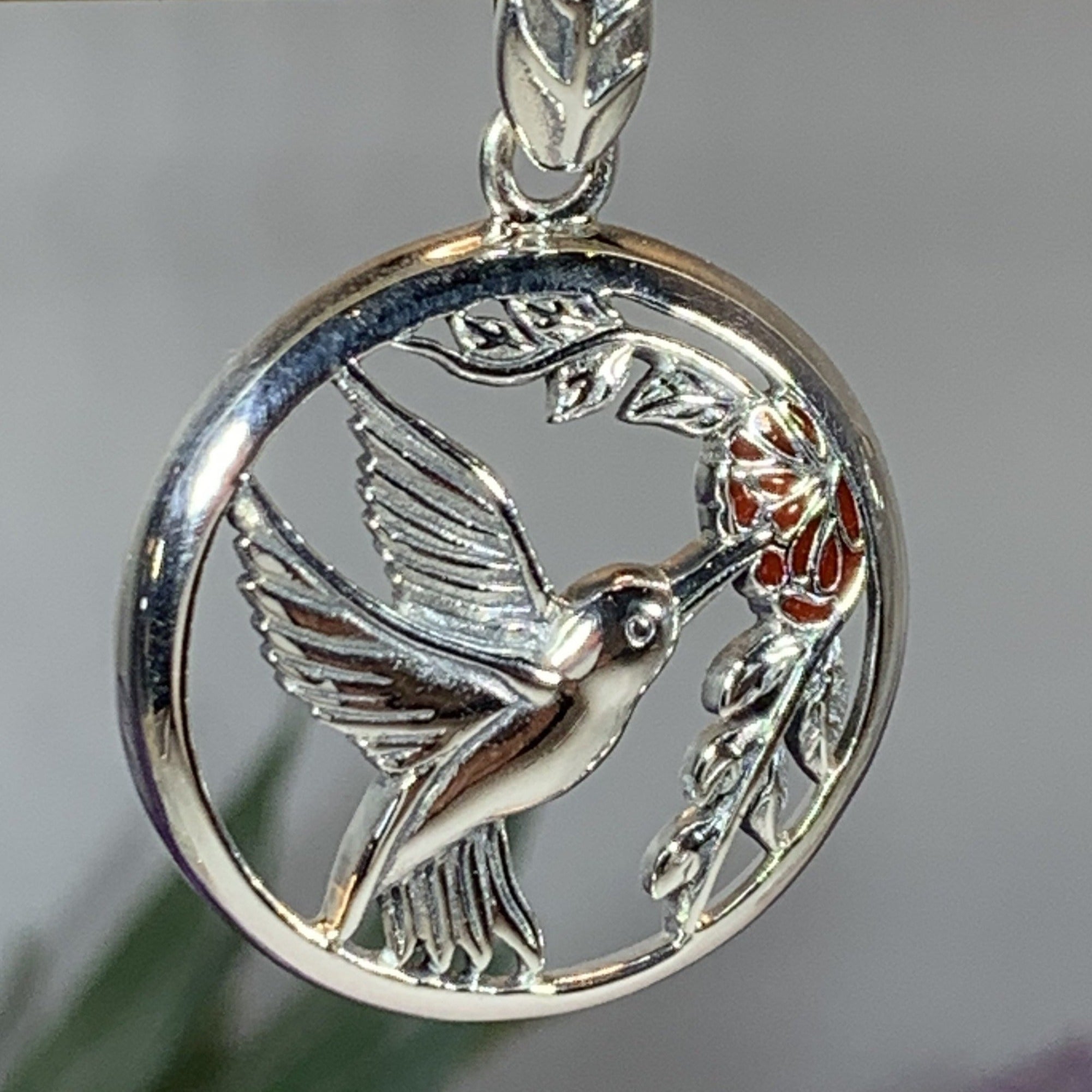 A beautifully designed solid sterling silver hummingbird pendant with stunning red enamel detail with a lovely red tropical flower, sitting on a sterling silver chain.