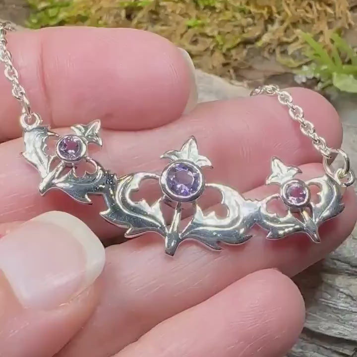 This three sweet little sterling silver thistles necklace will look lovely on you! The thistles are detailed and have a genuine amethyst center stone on each flower.