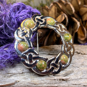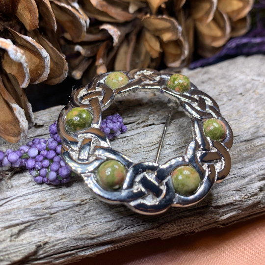 This piece uses Celtic knot work interlaced to form a circular brooch. Within the weaving there are six polsihed marble stones that come from the Isle of Iona in Scotland.