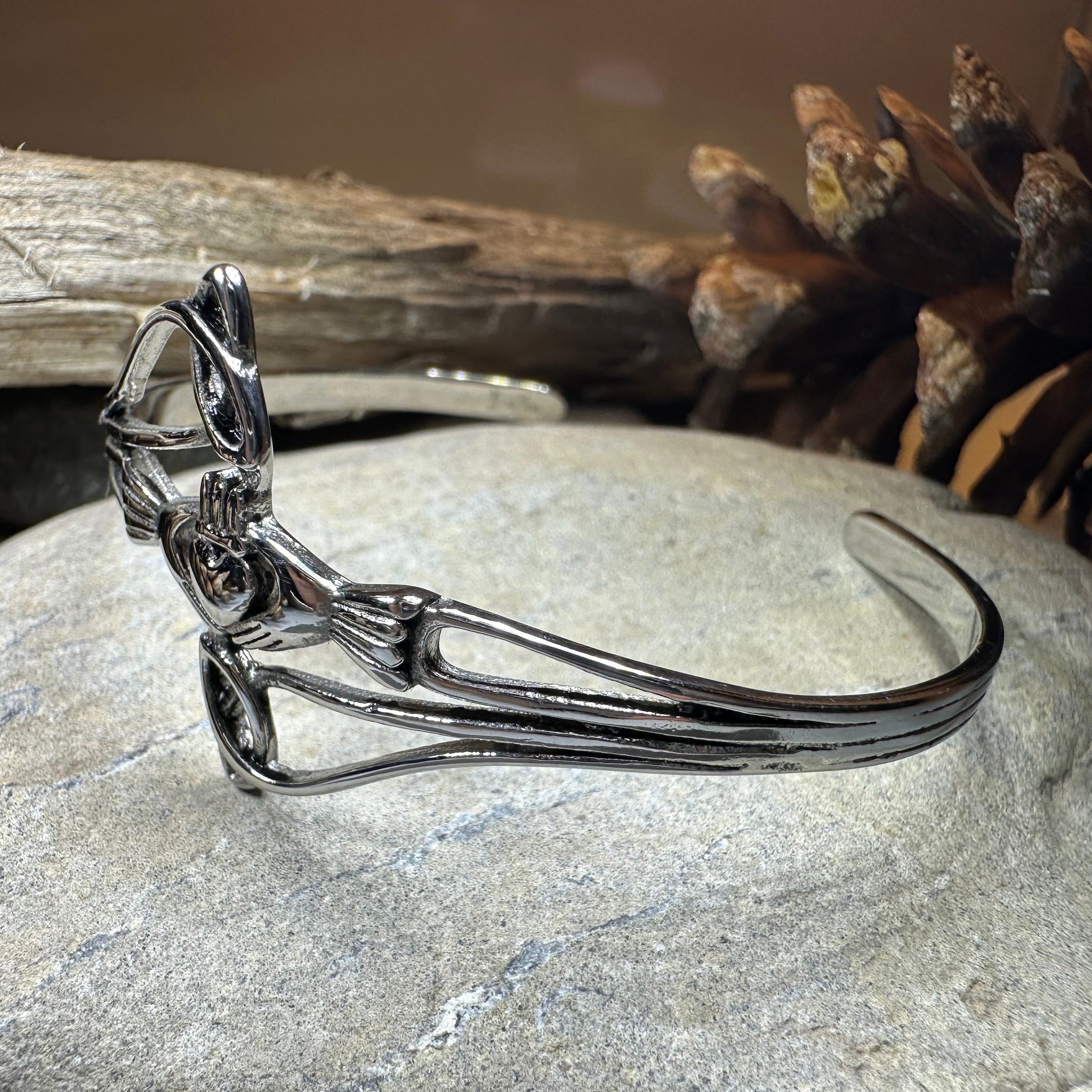 Stunning! Our highly polished Pewter Claddagh Bangle Bracelet features the 17th century Claddagh design, embraced on both sides an elegant sweeping Celtic knot work pattern.