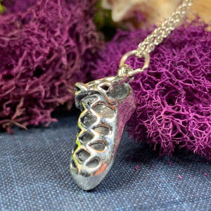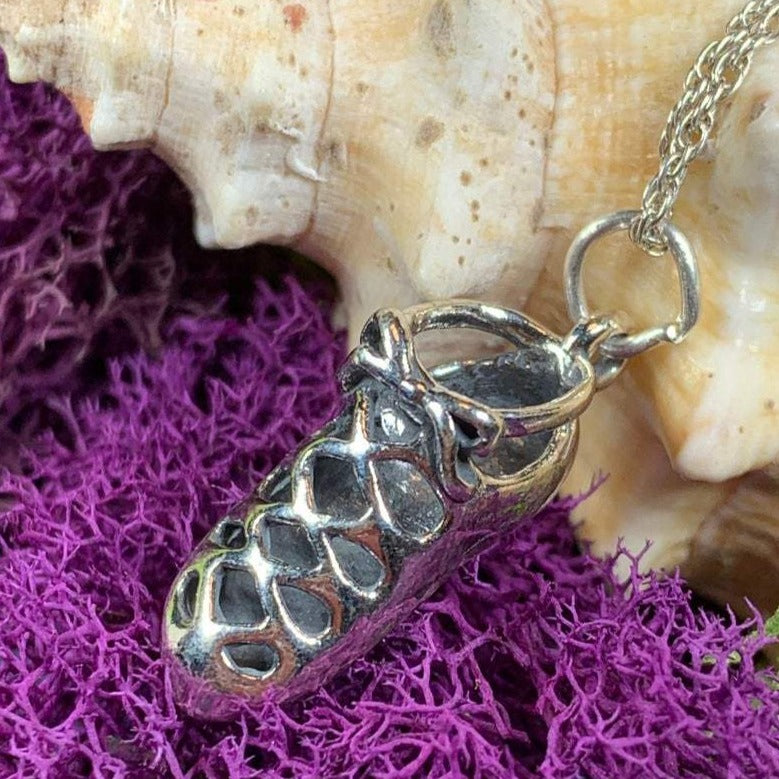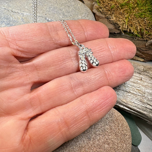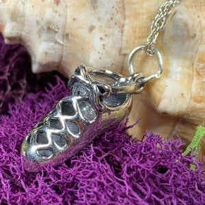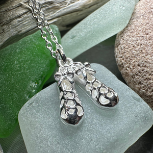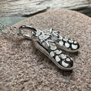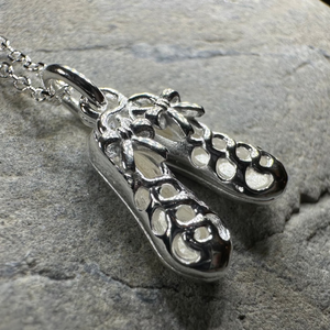 A lovely 3/4" x 1/2" sterling silver dance shoe on a sterling silver chain...the perfect gift for the Celtic dancer in your life. These three demensional shoes are the perfect replica of the traditional Irish soft shoes called ghillies.
