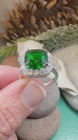 The traditional elements of the classic ladies cocktail ring with a glowing emerald cubic zirconia - sterling silver with a green emerald center stone and dazzling diamond cubic zirconia accents. This gorgeous stone shines in several shades of an amazing deep green color!