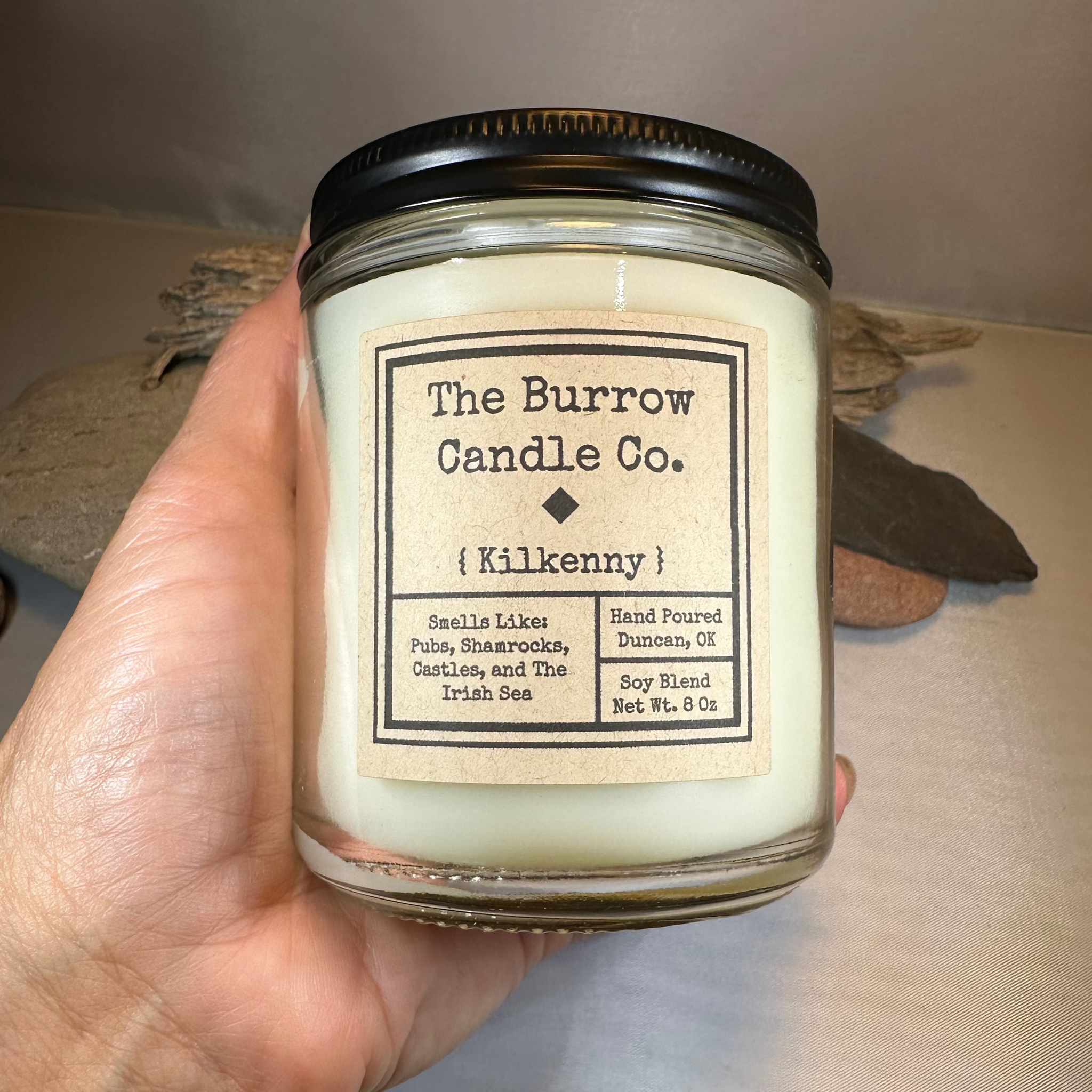 8oz Kilkenny scented hand-poured soy candle - smells like pubs, shamrocks, castles and the Irish Sea! Handmade in the USA.