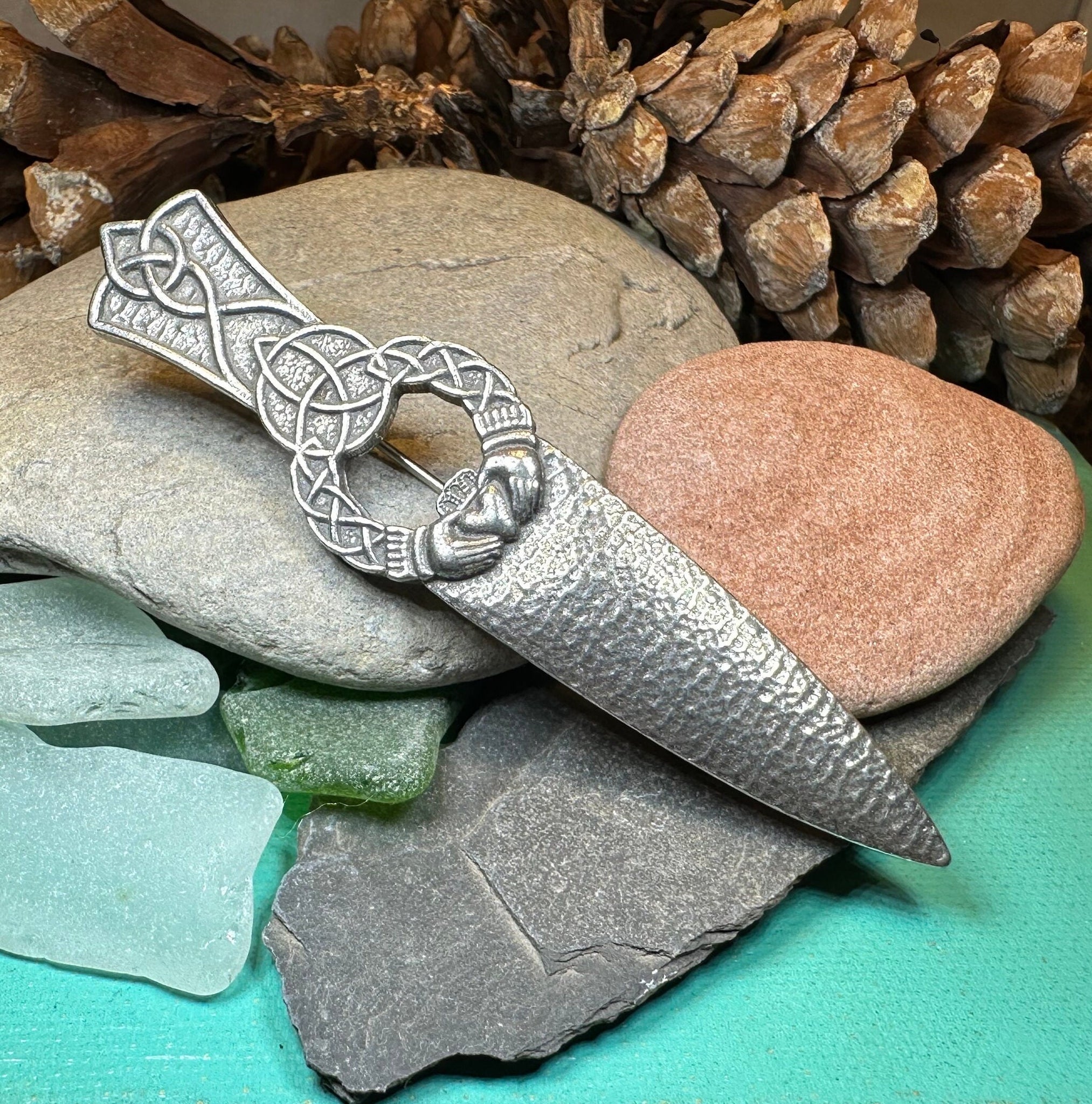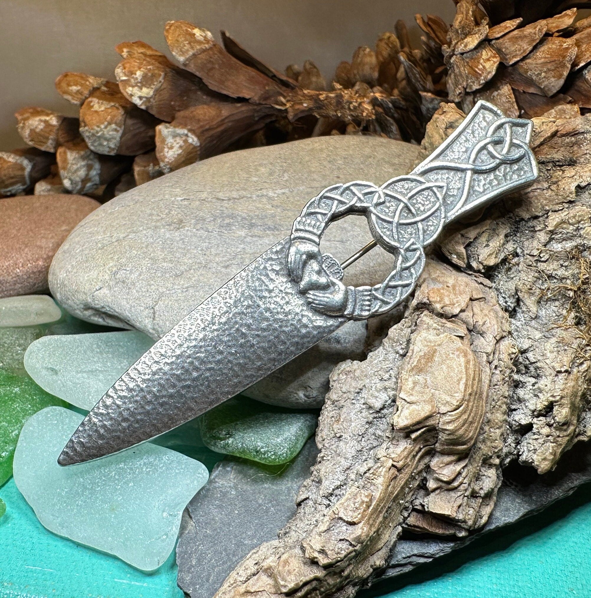 A beautiful Irish Claddagh & Celtic Knot kilt pin for your kilt, coat, sweater or jacket.