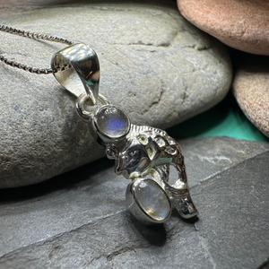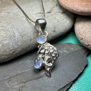 Solid Sterling Silver Celtic Fish Pendant with authentic rainbow moonstone or blue labradorite.