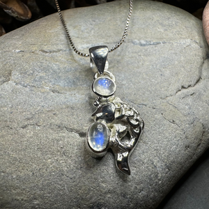 It comes with a sterling silver chain and a choice of rainbow moonstone or blue labradorite gems. Hallmarked 925.