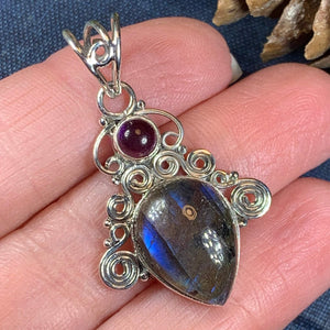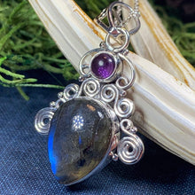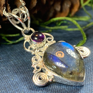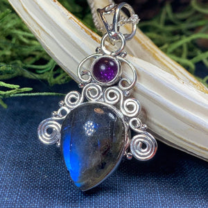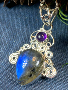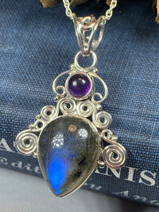 This Solid Sterling Silver Labradorite and amethyst pendant is a high quality stone with amazing flashing color!